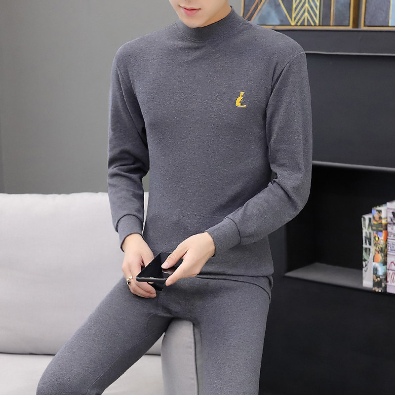 Men's Autumn Clothing Sanitary Pants Suit Pure Cotton Middle Collar Autumn Winter Fever Coat Underwear Thin and half high collar shirt Nets pants
