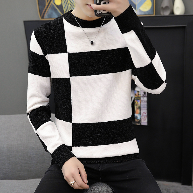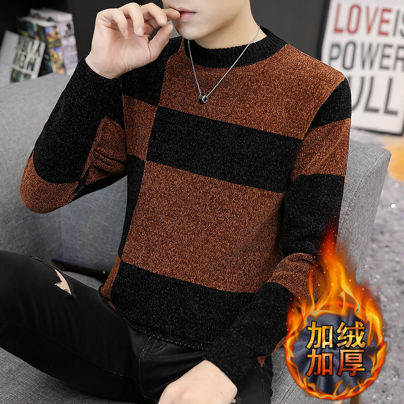 Chenille sweater men's Korean version of the round neck trend personality plus velvet thick sanitary clothing men's handsome knitted bottoming shirt