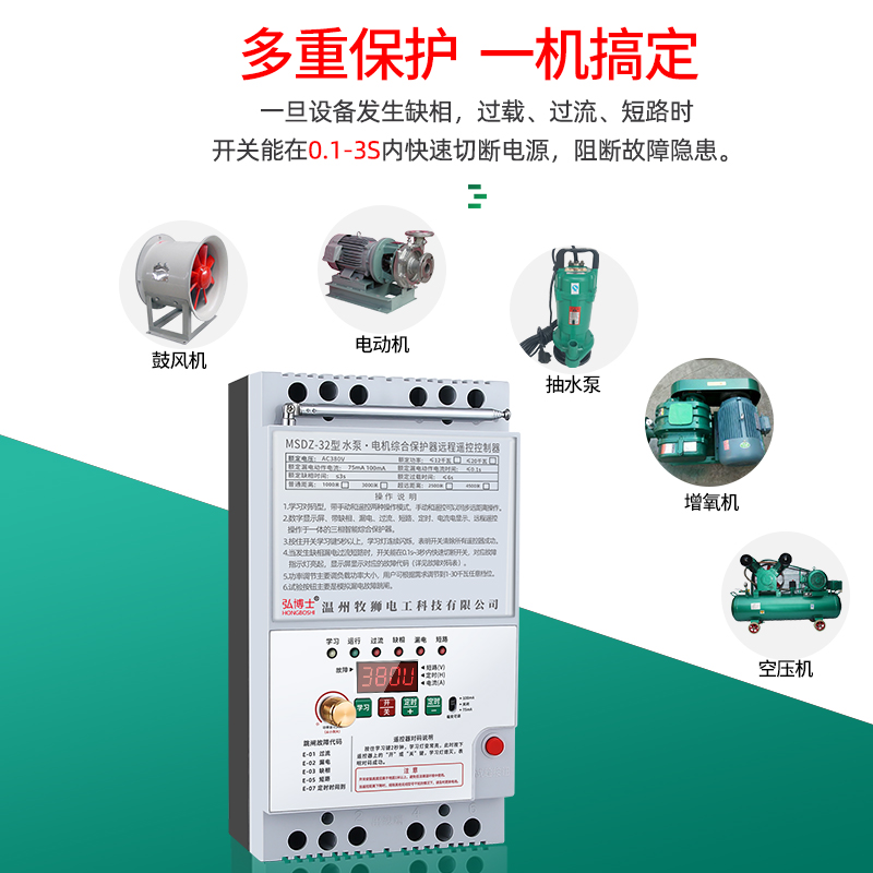 Water pump wireless remote control switch 380V three-phase deficiency phase motor integrated protector remote water pump remote control electric brake