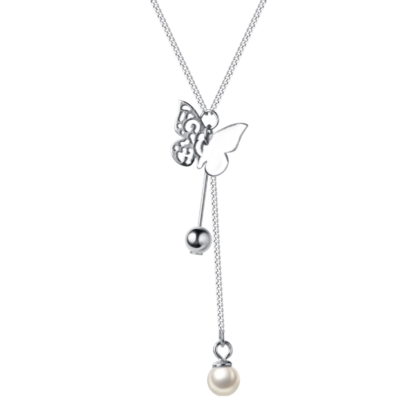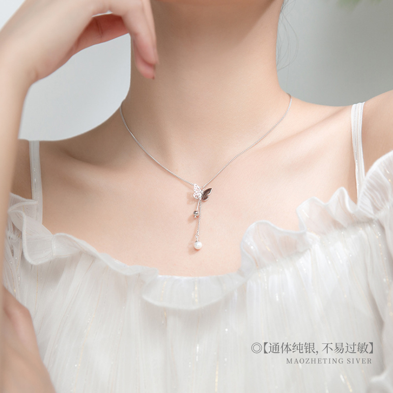 Cat Jellyfish S925 Pure Silver Pearl Streaming Su Butterfly Necklace Woman Han Edition Brief Personality Temperament Student Bestie Lock Bone Chain