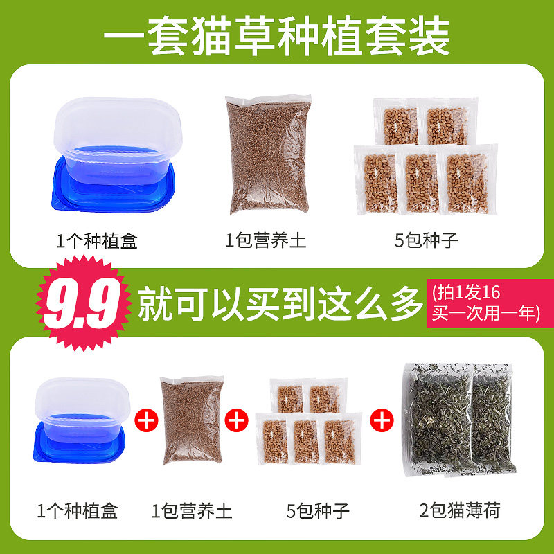 Catwort 4 sets + 3 packs of catnip Catnip 2 sets + 2 packs of catnip (can be planted 10 times 80% customer choice) - super affordable !!! Cat grass 2 sets + 2 packs of catnip + 1 catnip lollipop Cat grass 5 sets + 3 packs of catnip (buy once for a year) Hot selling !!! Cat grass 2 sets + cat canned 2 cans 85g (delicate meat nutrition hydration) cat grass 2 sets + cat canned 4 cans 85g (delicate meat nutrition hydration) cat grass 2 sets + fun nurse lecithin 300g (hair removal)