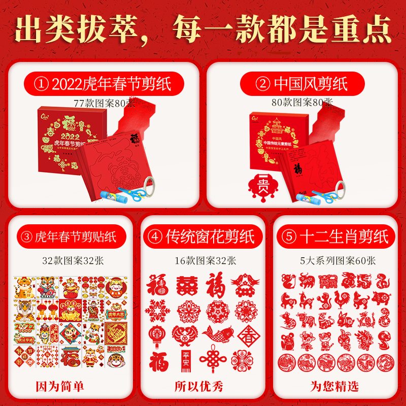 2022 Year of the Tiger Spring Festival paper-cut Chinese style window paper children's baby handmade diy special red paper 12 Zodiac pattern manuscript tool kindergarten students semi-finished new year paper-cut