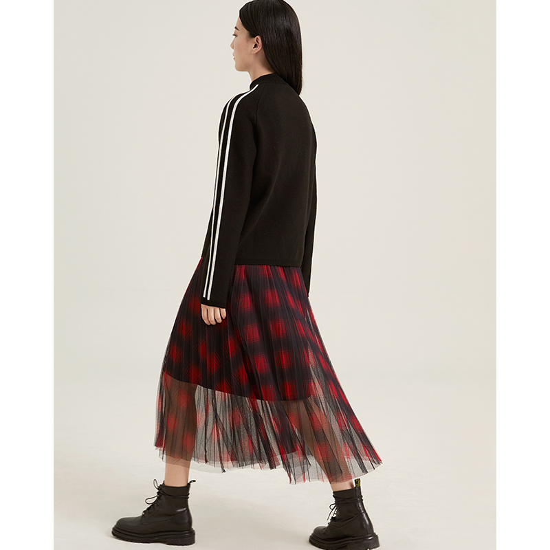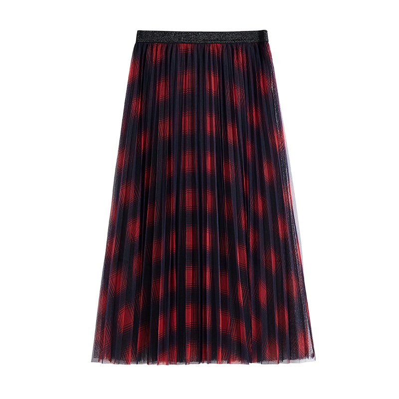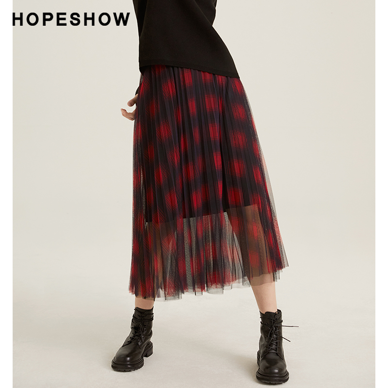 Red sleeve hopeshow skirt women's winter new plaid long pleated mesh skirt