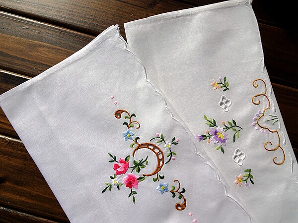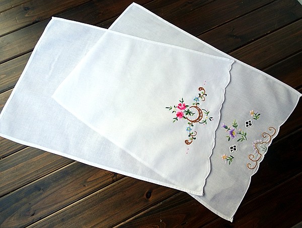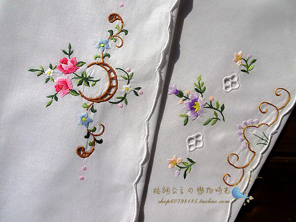 This one with red flowers on a white background, only one side is embroidered, this one is a purple flower on a white background, two, only one side is embroidered. This item has been washed and ironed. Mind to shoot carefully