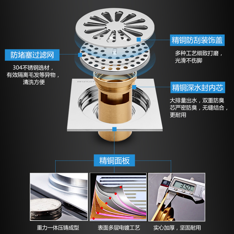 Day Fung Floor Drain Deodorizer Cosmetic room Washing machine Dual-purpose all-copper anti-insect anti-clogging toilet hair filter