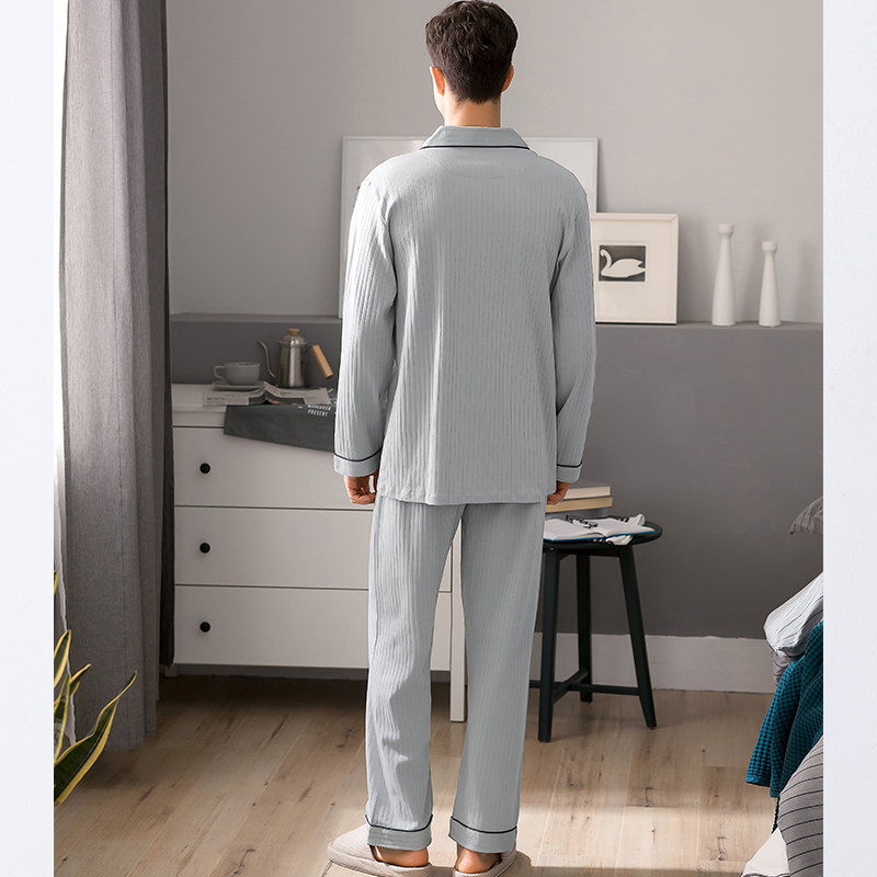 Fenteng spring and Autumn men's long-sleeved pajamas pure cotton solid color vertical stripe men's youth cardigan lapel home clothes two-piece set
