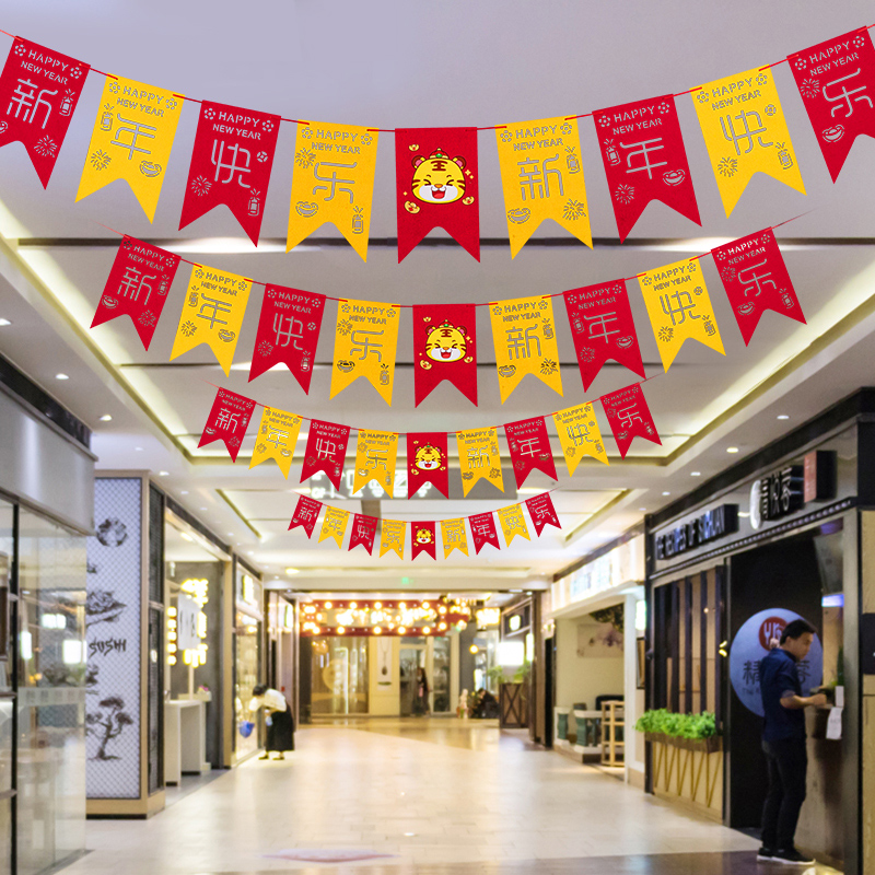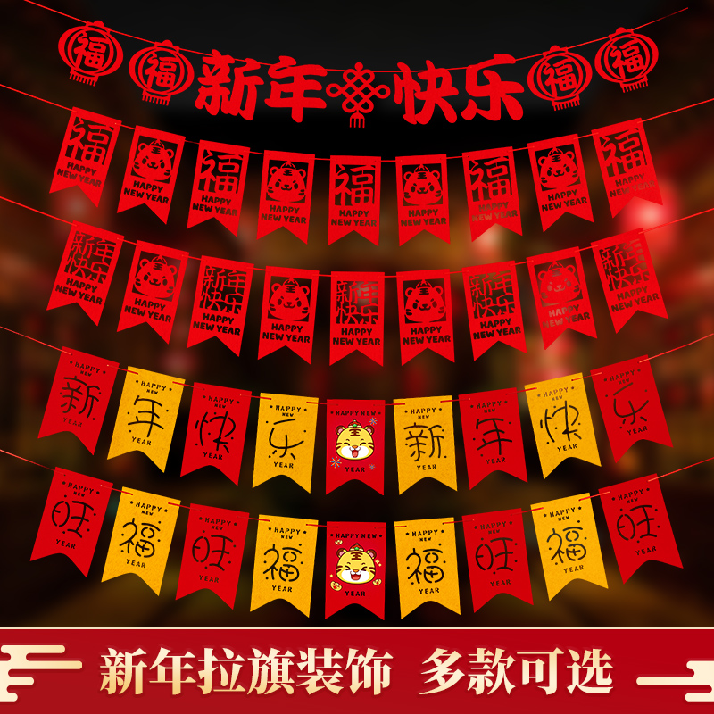 2022 Spring Festival, Year of the Tiger, New Year Decoration, New Year Hanging, Fu-character hanging flag, indoor living room, flower scene layout
