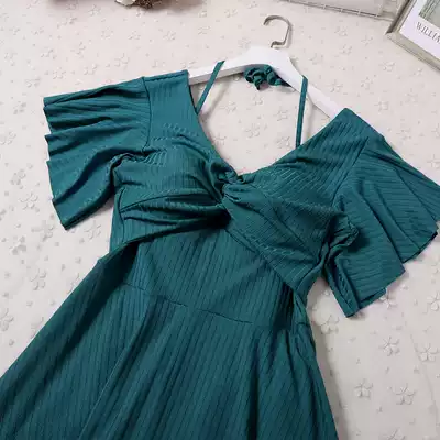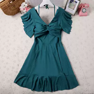 Large size hot spring swimsuit women 200kg fat mm Conservative belly covered thin one dress big chest V collar short sleeve swimsuit
