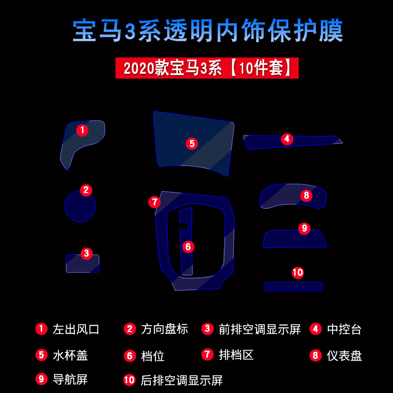 Interior full set of protective film (10 sets) Interior protection (film 8 sets) Gear cup area (3 sets) Center control steering wheel standard (3 sets) Navigation film instrument film(2 pieces