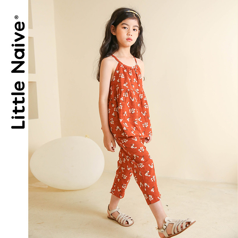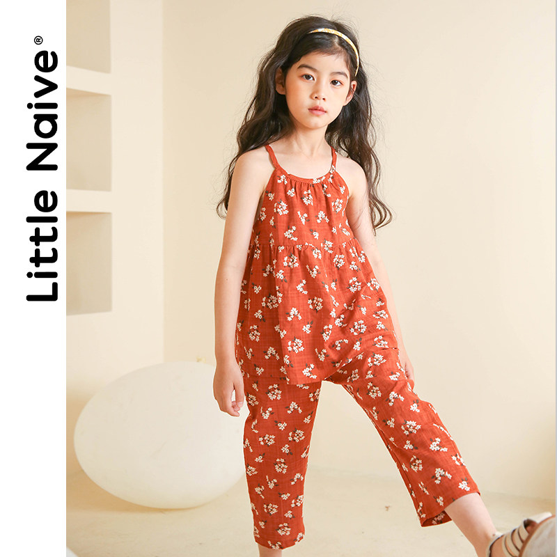 LitteNaive Girls Floral Suspender Suit Trousers Cotton Straight Pants 2021 summer new