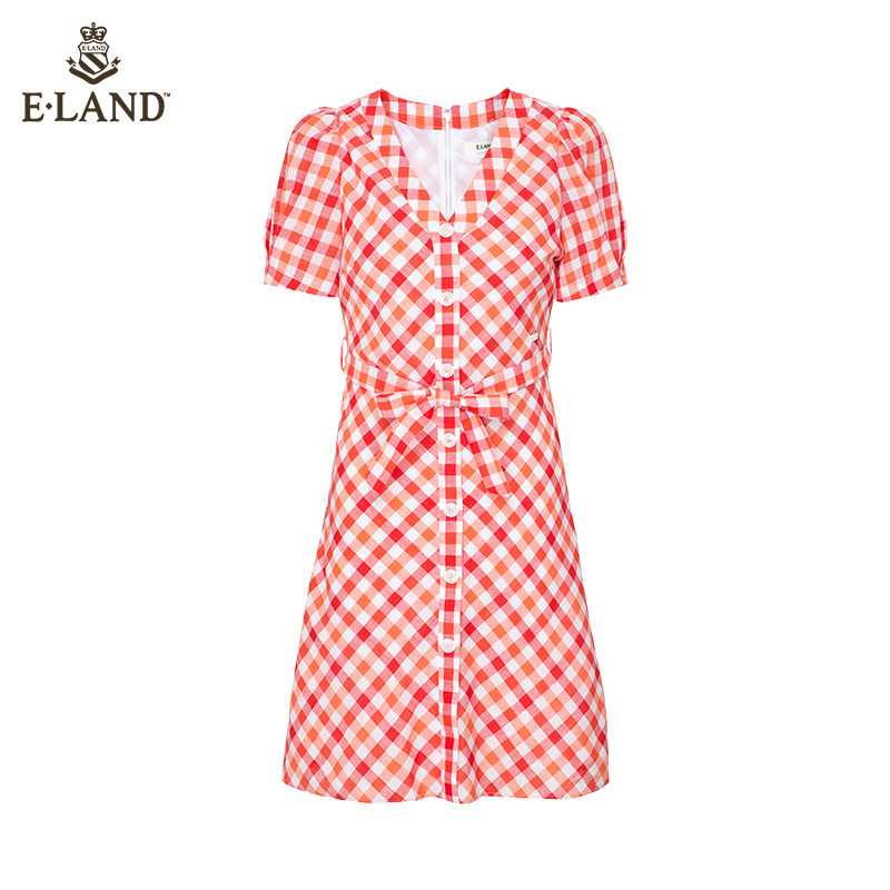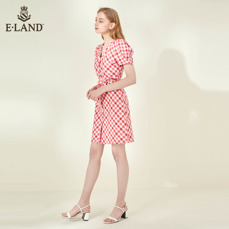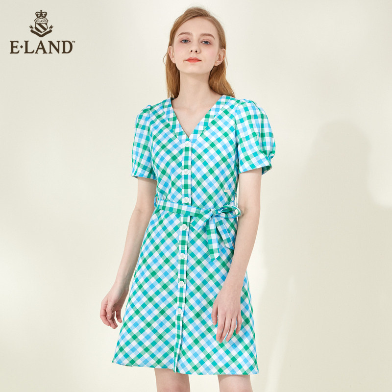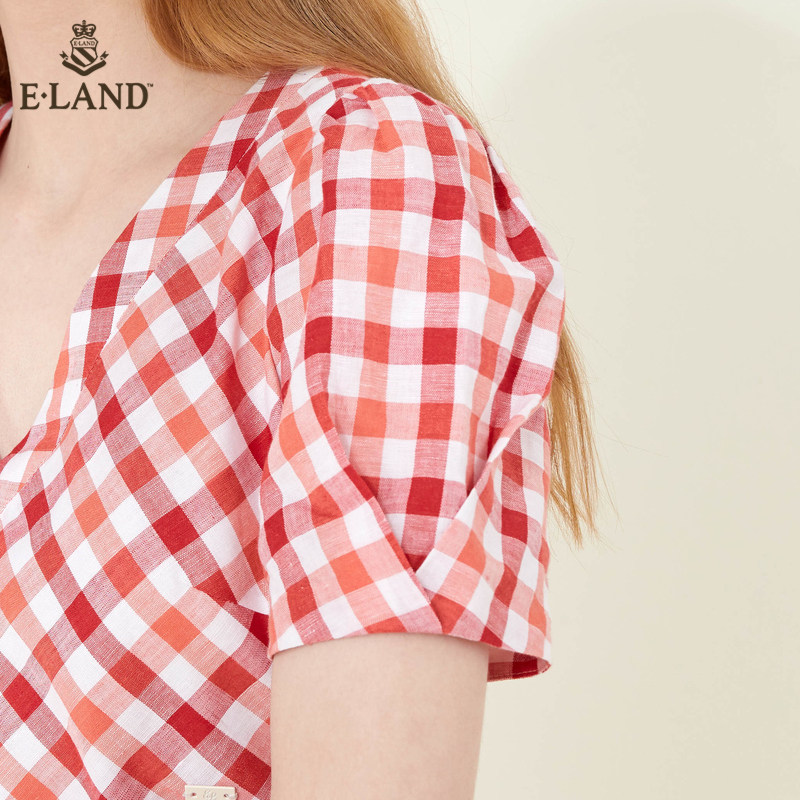 ELAND clothes lovers spring summer fashion sweet and temperamental style grid short sleeve V collar cashew slim fit lady
