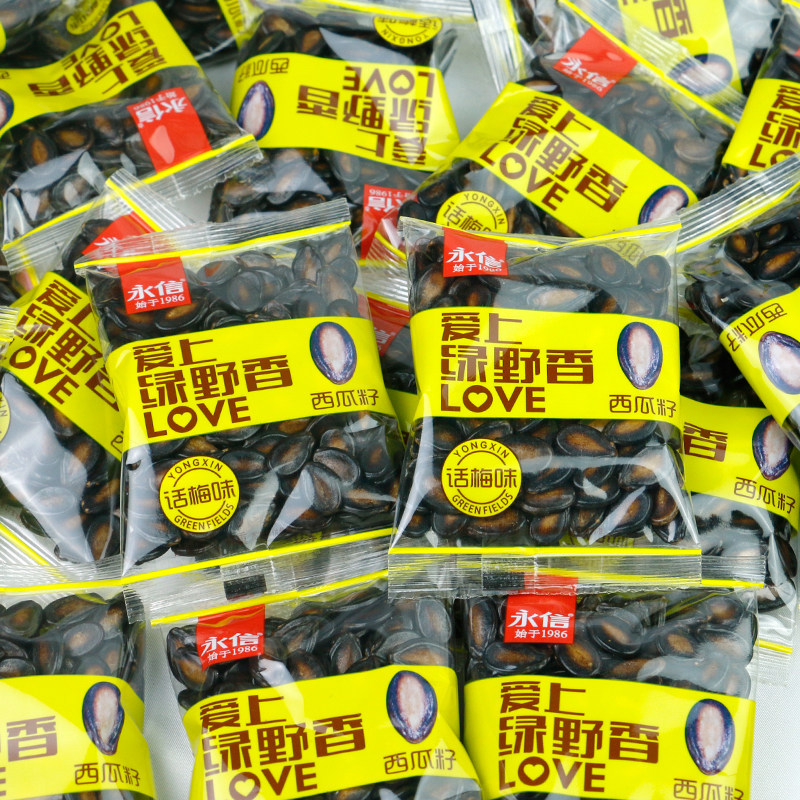 Yongxin falls in love with green and savory words plum taste Western melon seeds small packaging sour sweet casual snacks black melon seeds fried stock