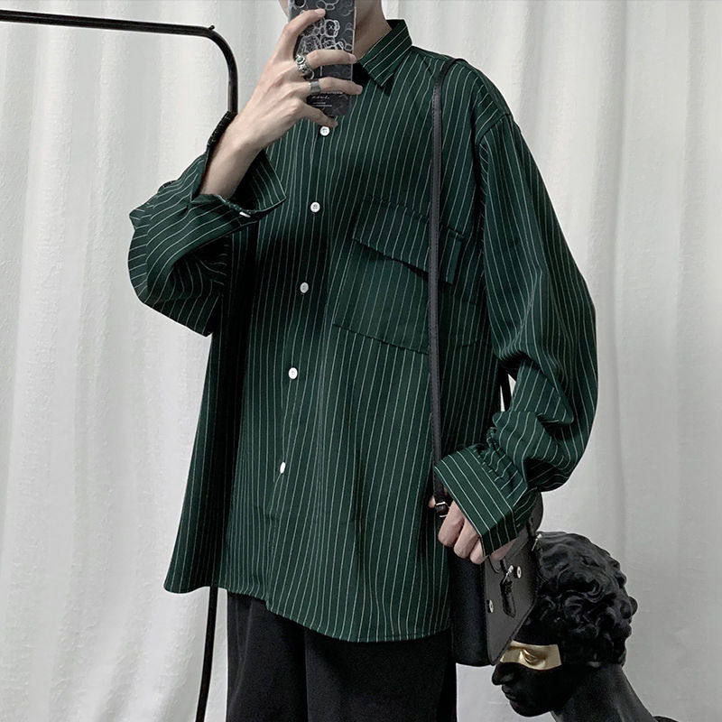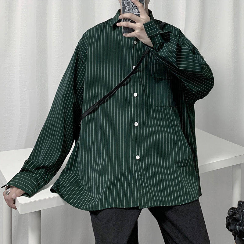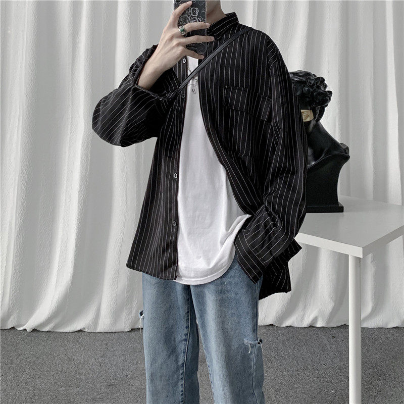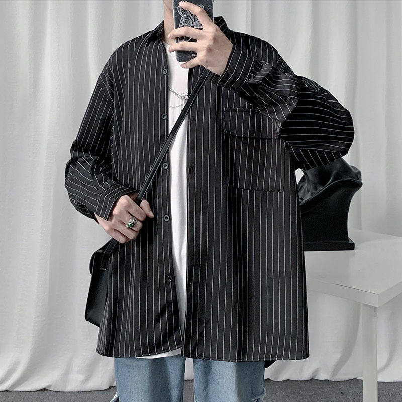 Ruffian handsome ins shirt men's Hong Kong style trendy long-sleeved shirt Korean version of Harajuku style loose casual striped shirt inch