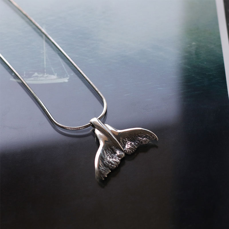 Small whale tail pendant Small whale tail with female silver chain Small whale tail with male silver chain Large whale tail pendant Large whale tail pendant with leather rope Large whale tail pendant with silver chain
