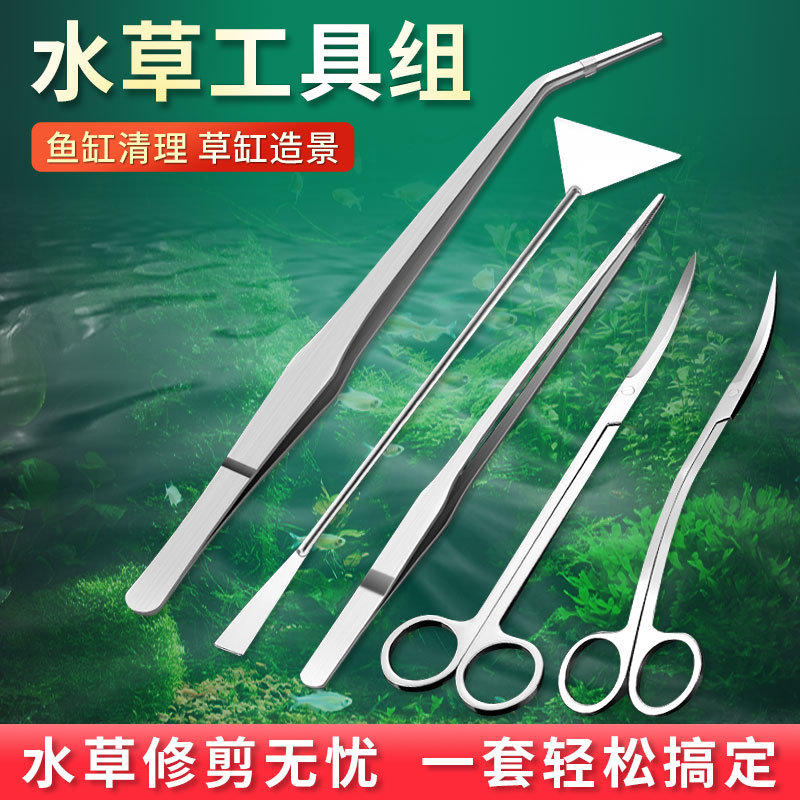 Aquatic grass trimming tool set mirror straight curved scissors tweezers stainless steel long scraping algae knife elbow wave flat sand shovel