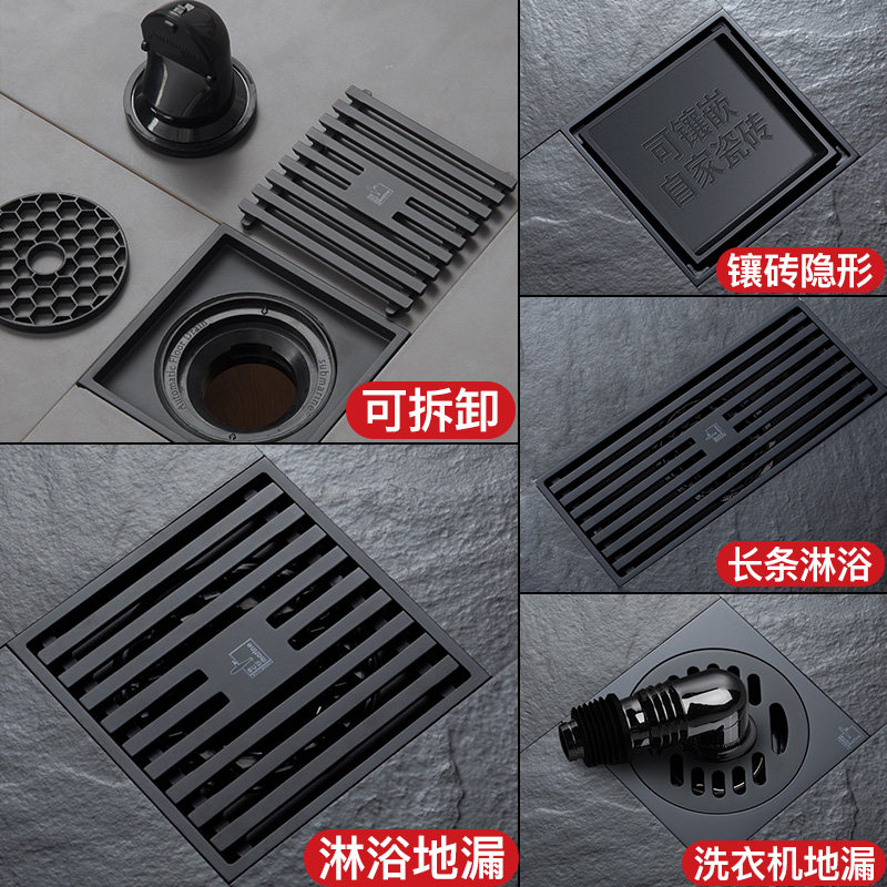 Black Kitchen floor drain Black Shower floor drain Black Washing machine floor drain Elbow Black Fully sealed Washing machine floor drain Black Small hidden floor drain Black large hidden floor drain-Front black large hidden floor drain-back black strip