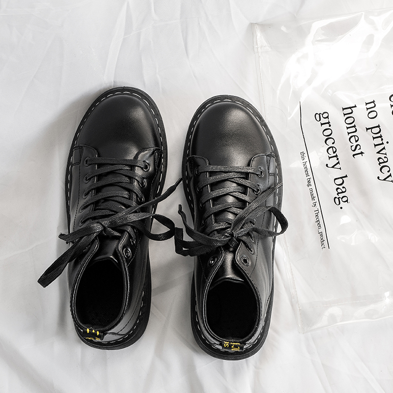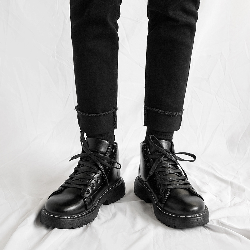 Winter leather boots men's British style black Martin boots high-top trendy shoes all-match plus velvet warm snow boots mid-tube short boots
