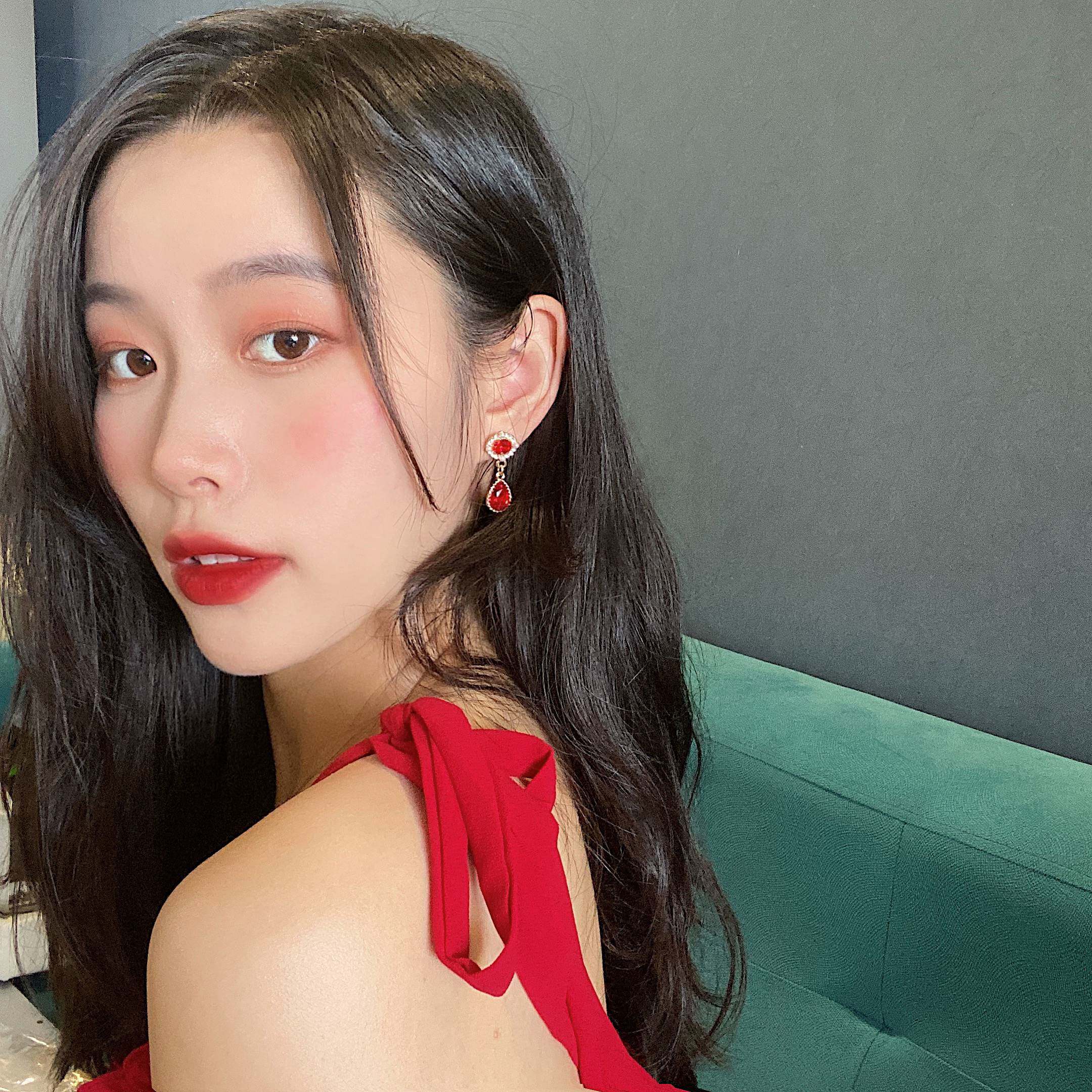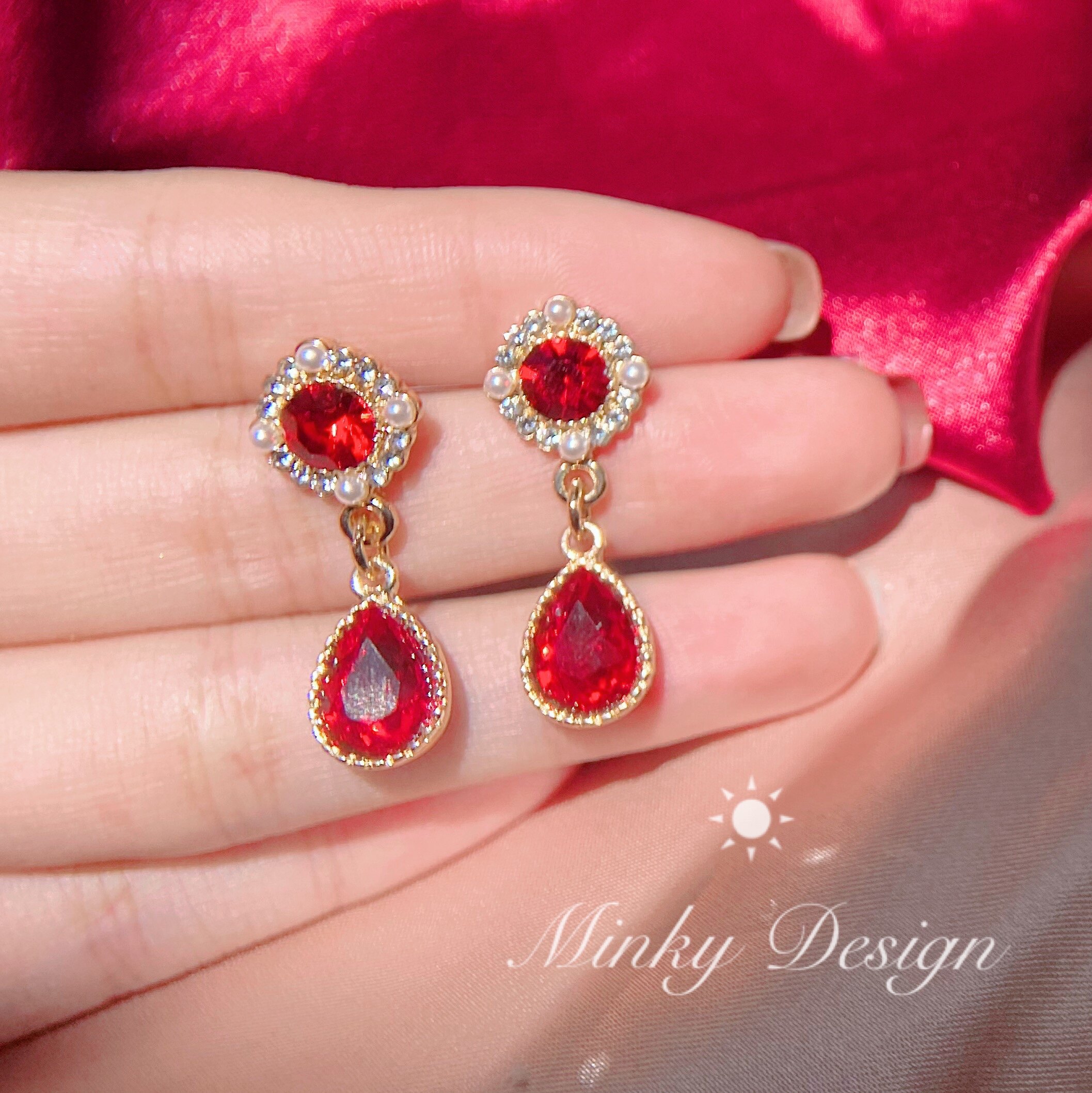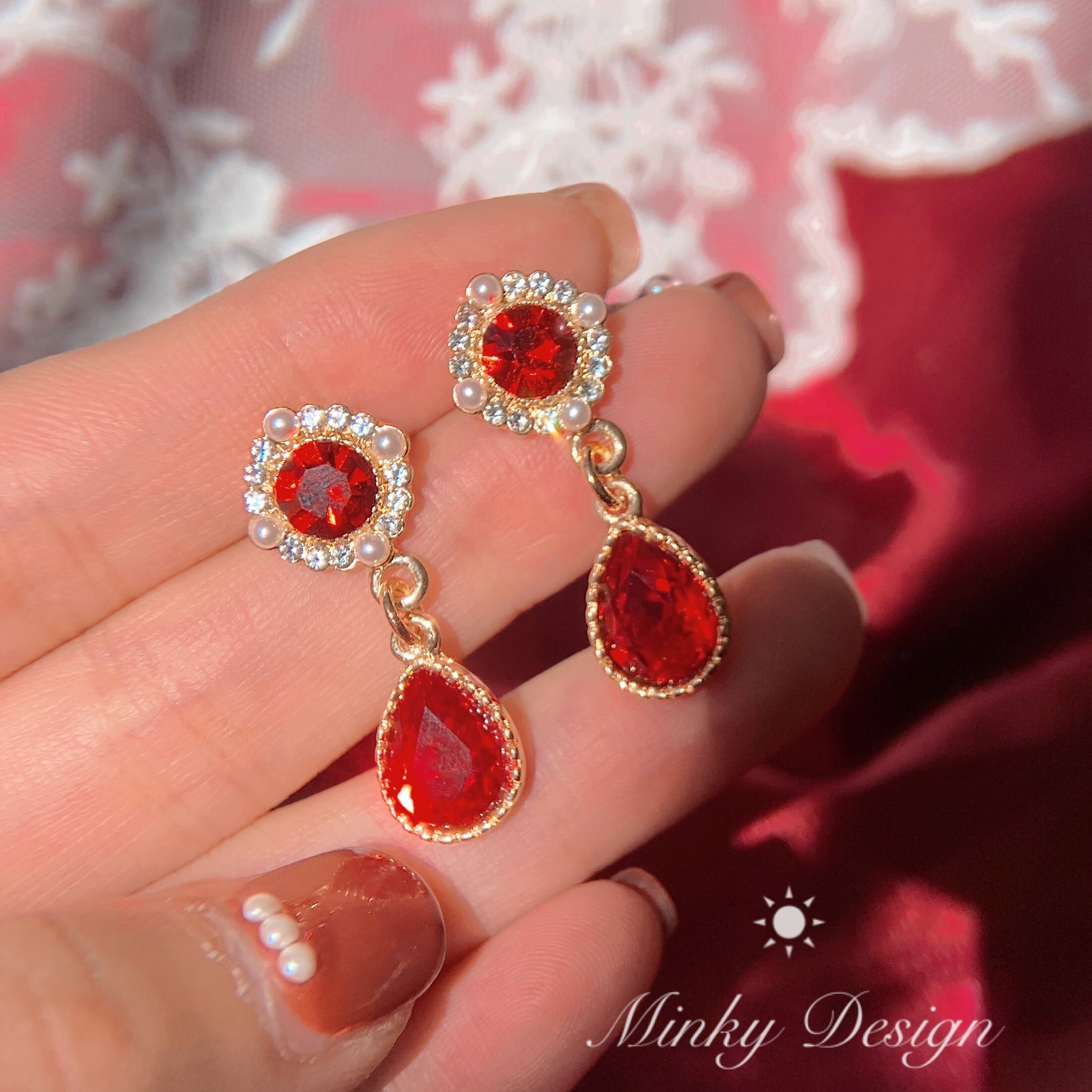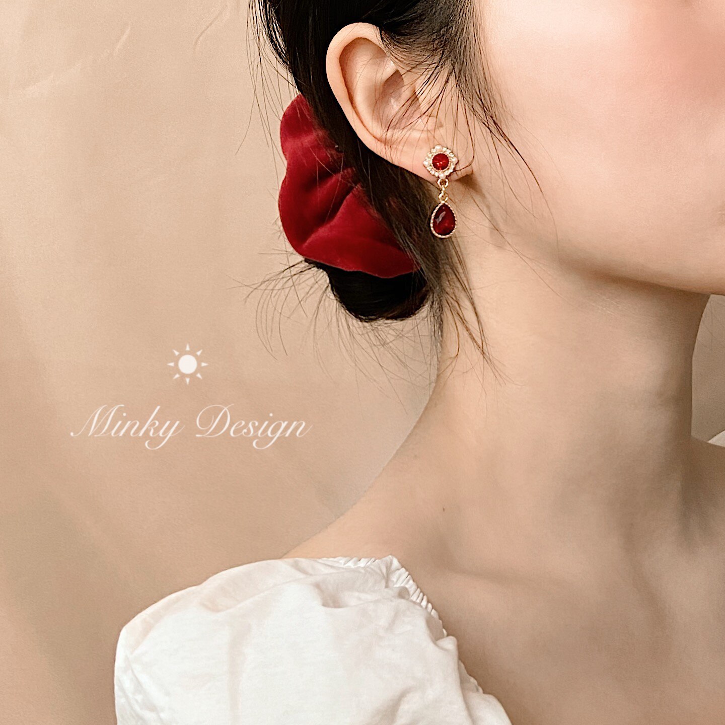 "Tipsy" red earrings red ear clip no ear holes female retro Port wind earrings drop earrings fine pearl tea series