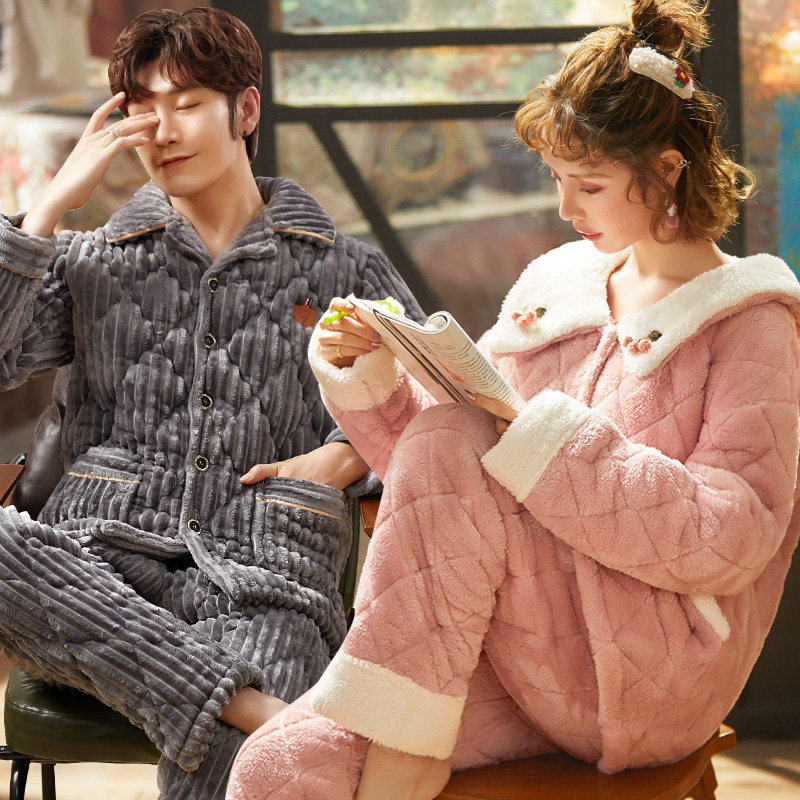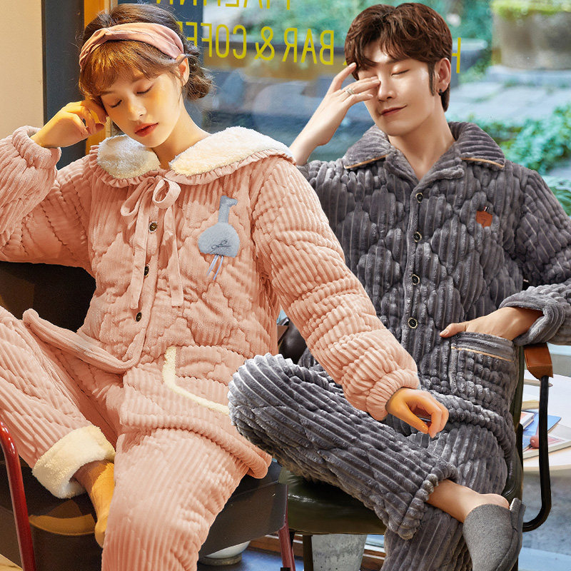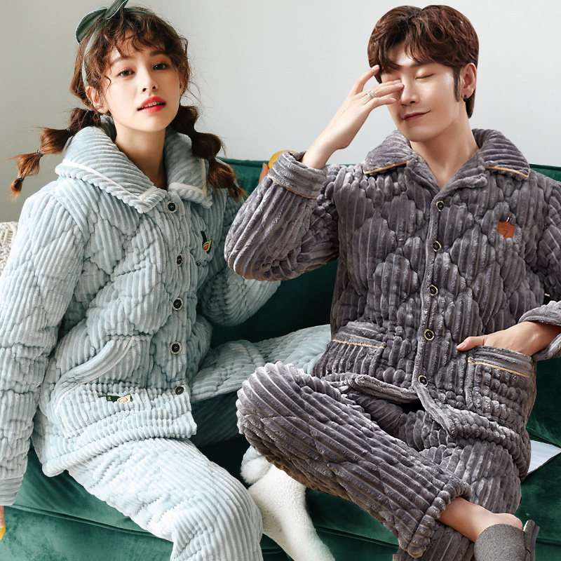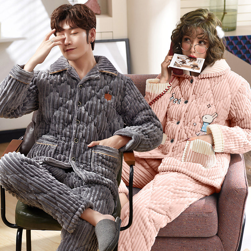 Couple pajamas female coral velvet padded cotton three-layer thickened autumn and winter home clothes men's velvet warm winter suit