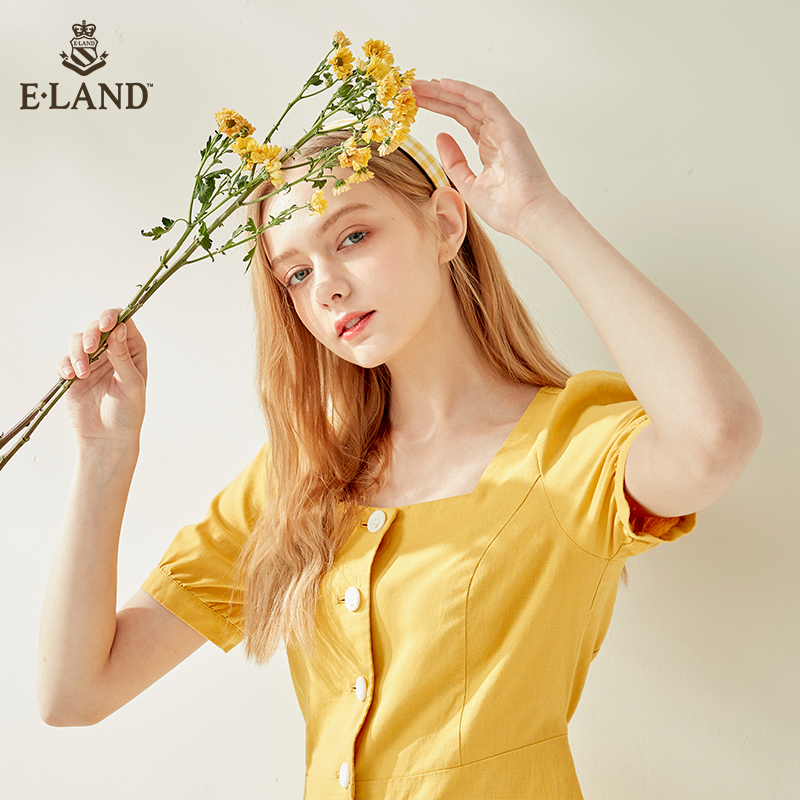 ELAND clothes lovers summer fashion French style square collar sweet and small crowdsourced long version cotton linen short sleeve foreign dress