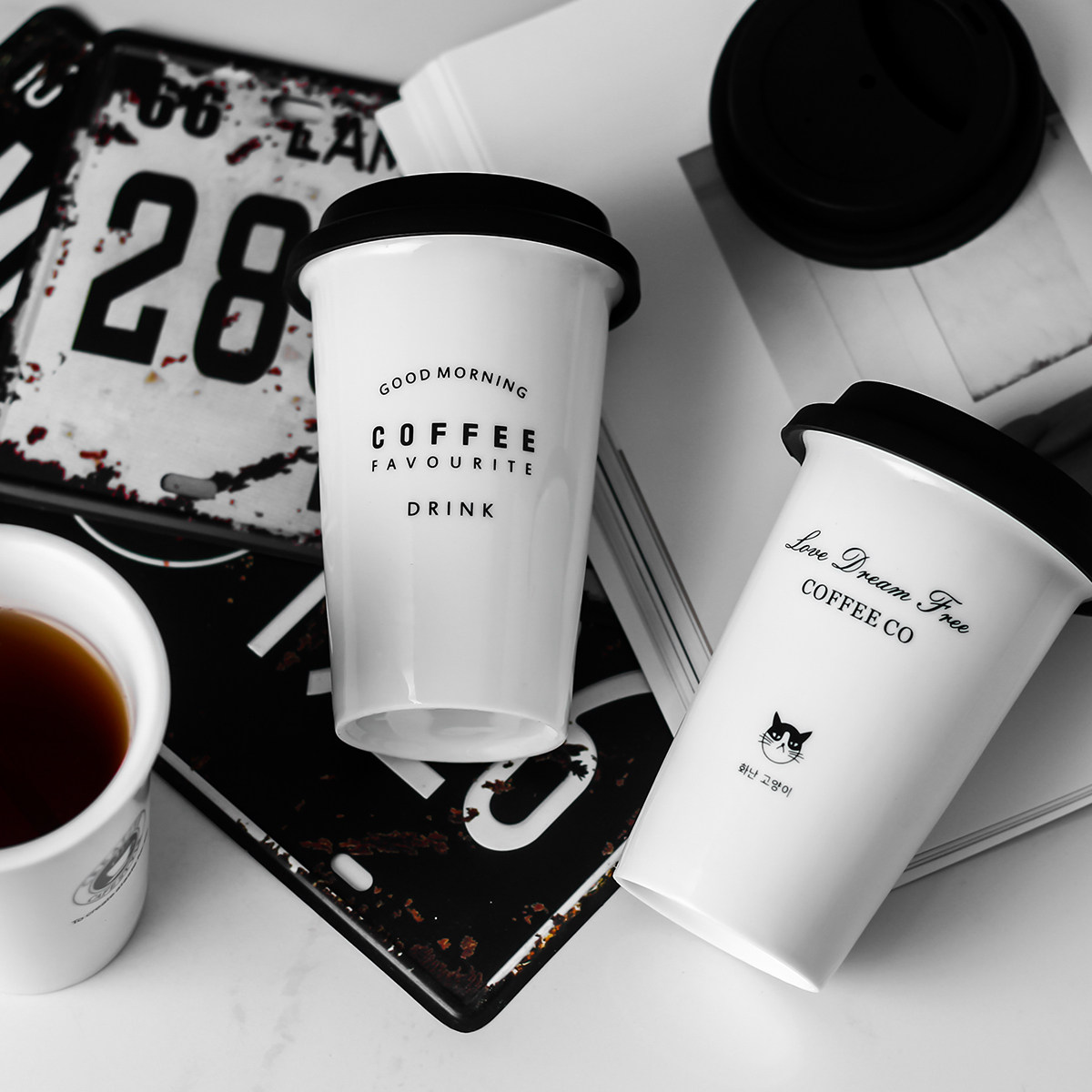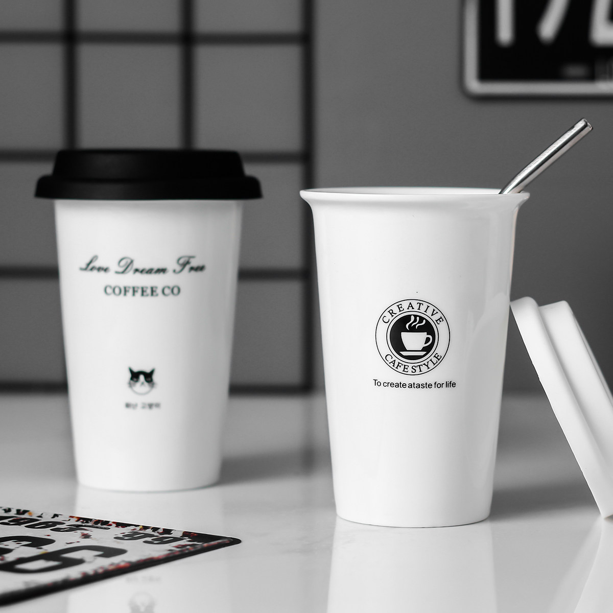 Collection Plus Purchase Cup Four-Eyed Cat Black Cover Straw Spoon Four-Eyed Cat White Lid Straw Spoon Cool Cat With Black Lid Spoon Straw Coffee Cup Black Lid Spoon Straw Bell