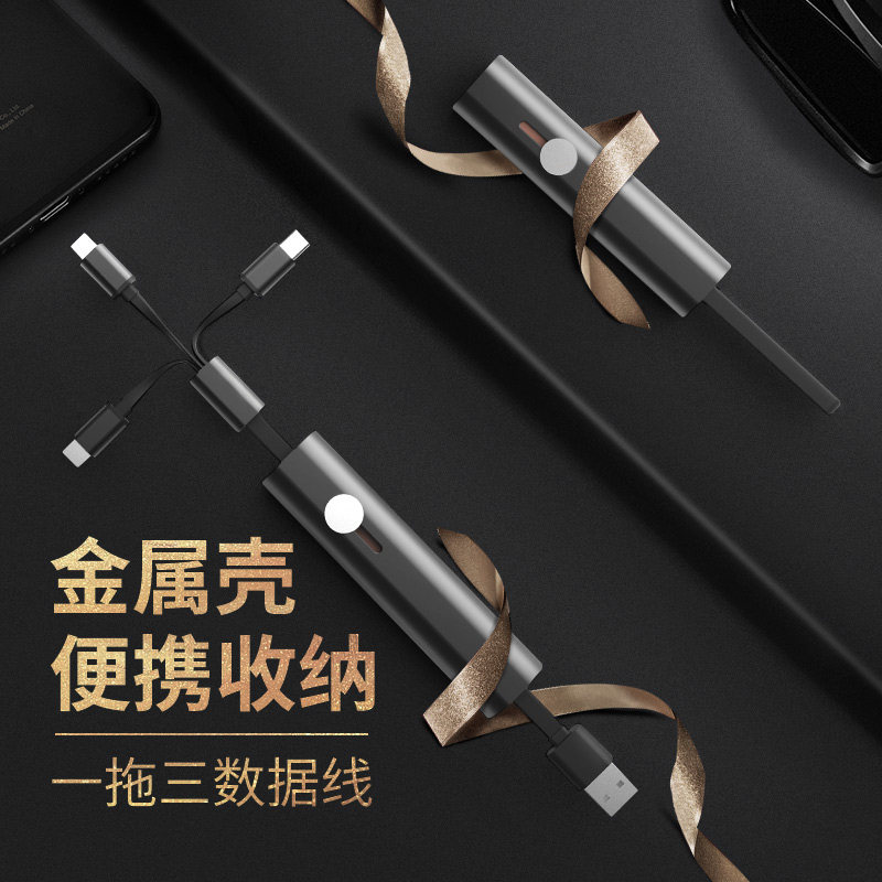 Phantom one-to-three metal storage line portable charging cable telescopic data cable suitable for Apple Huawei Android phones