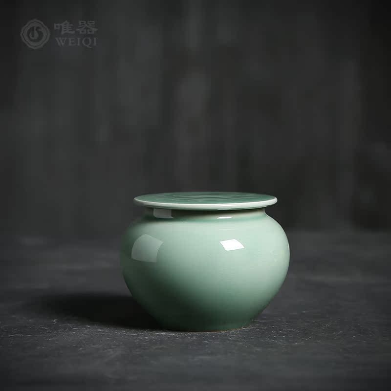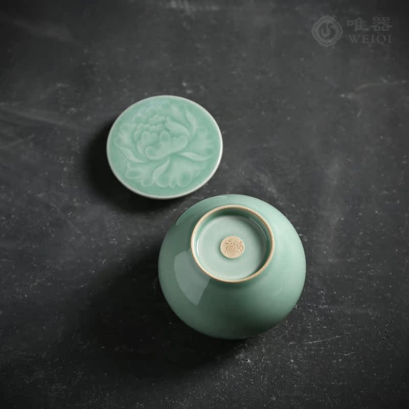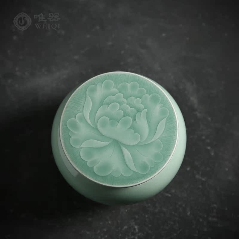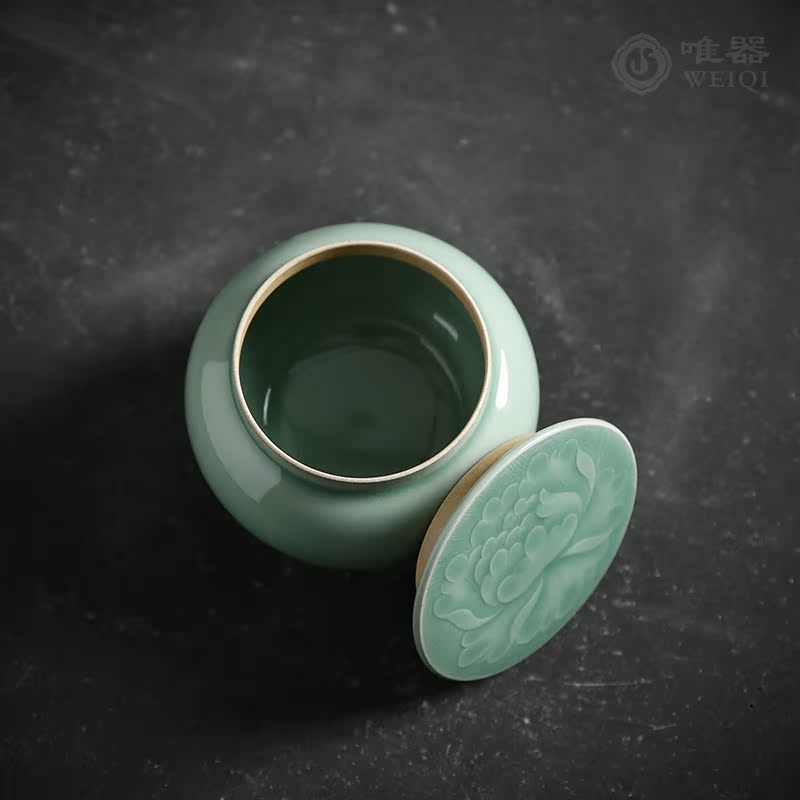 Qingporcelain Yang Jiangpeng All-handmade works Tea leaf jars Ceramic Wake-up Tea Pot Powder Green Peony Lettering Cover Jar