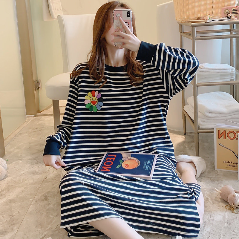 Sleepwear Lady Spring Autumn Pure Cotton Long Sleeve Sleeping Skirt Woman Long Version Over Knee Large Size Summer Thin student Cute Princess Dresses