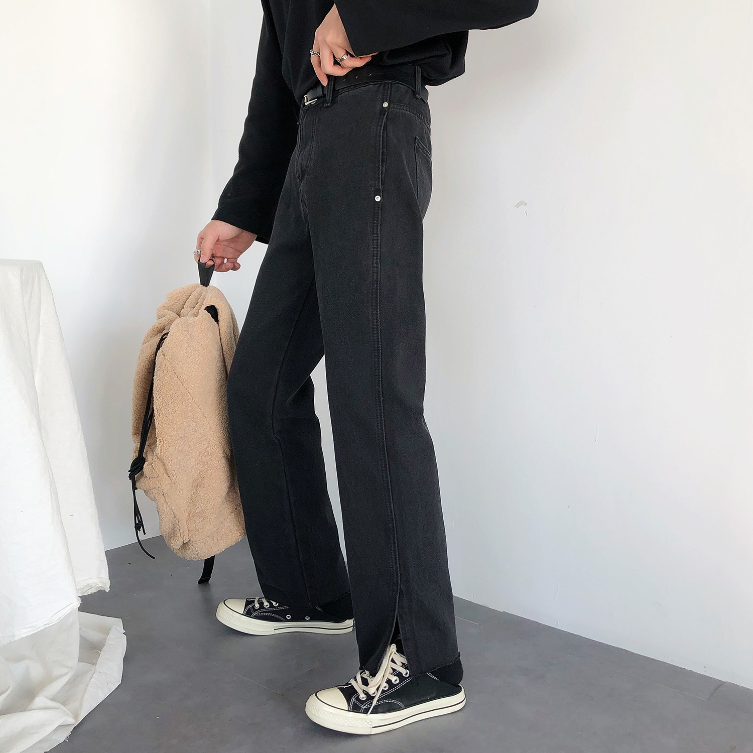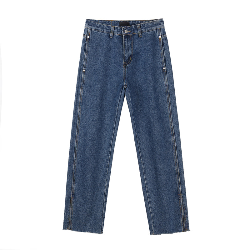 19studio Korean chic drop feel wide leg split pants retro burrs loose straight jeans men and women