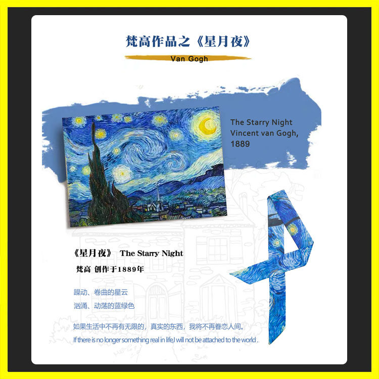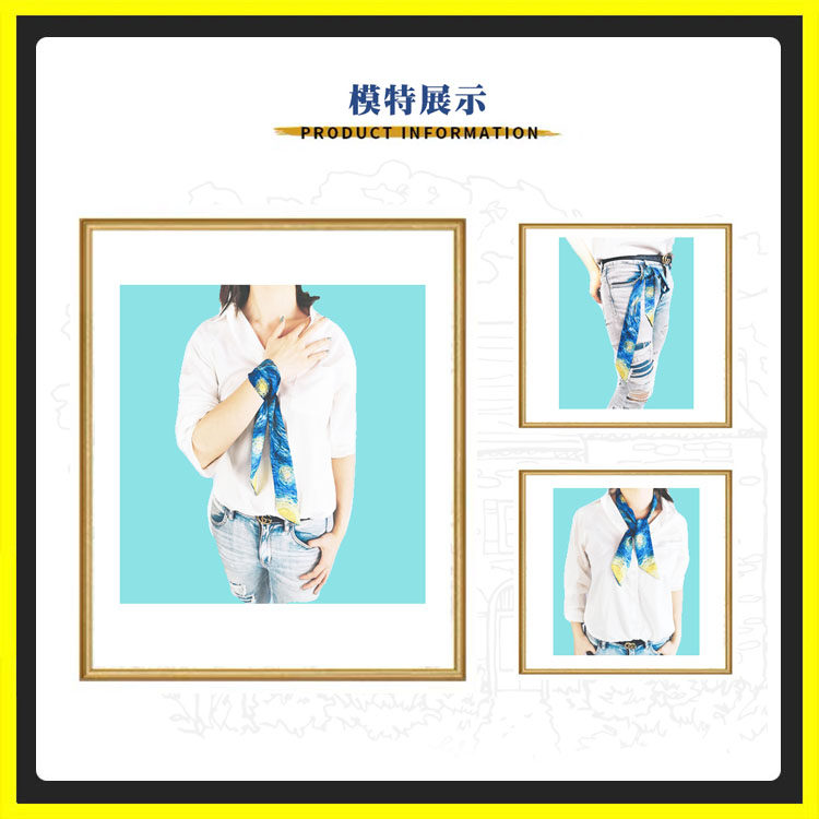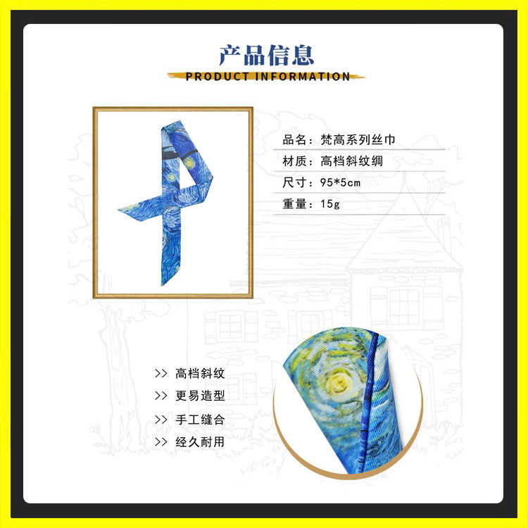 Van Gogh oil painting silk scarf hair band strap bag with strip silk with narrow retro art blue starred twill