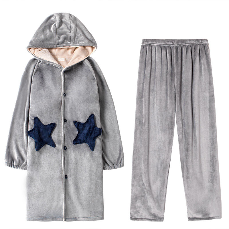 Antarctic nightgown men's winter thickened long coral velvet pajamas stars warm autumn and winter flannel bathrobe set