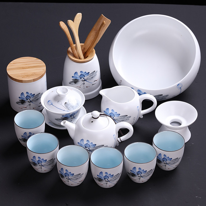 Lingsheng Zen-style Kung Fu tea set home complete set of matt simple Chinese-style cover bowl tea cup white porcelain celadon