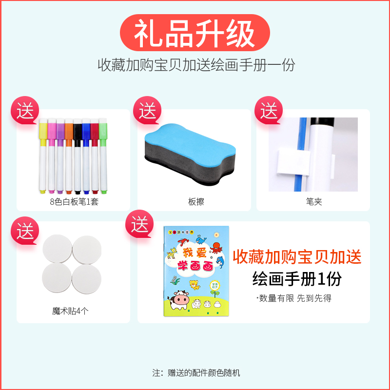 Non-magnetic black drawing board with 8-color pen 1 set of pen holder 1 eraser 1 magic sticker 4 magnetic black drawing board send eight color pen 1 set of pen clip 1 eraser 1 magic stick 4 magnetic red drawing board to send 8 color pen 1