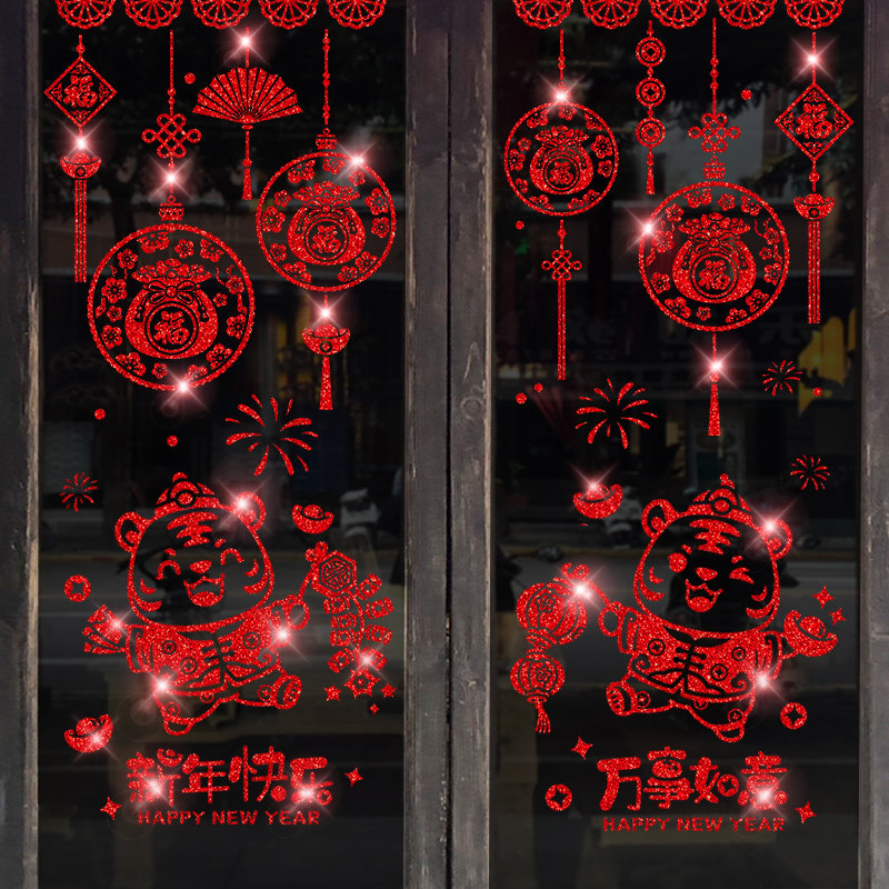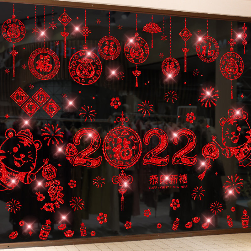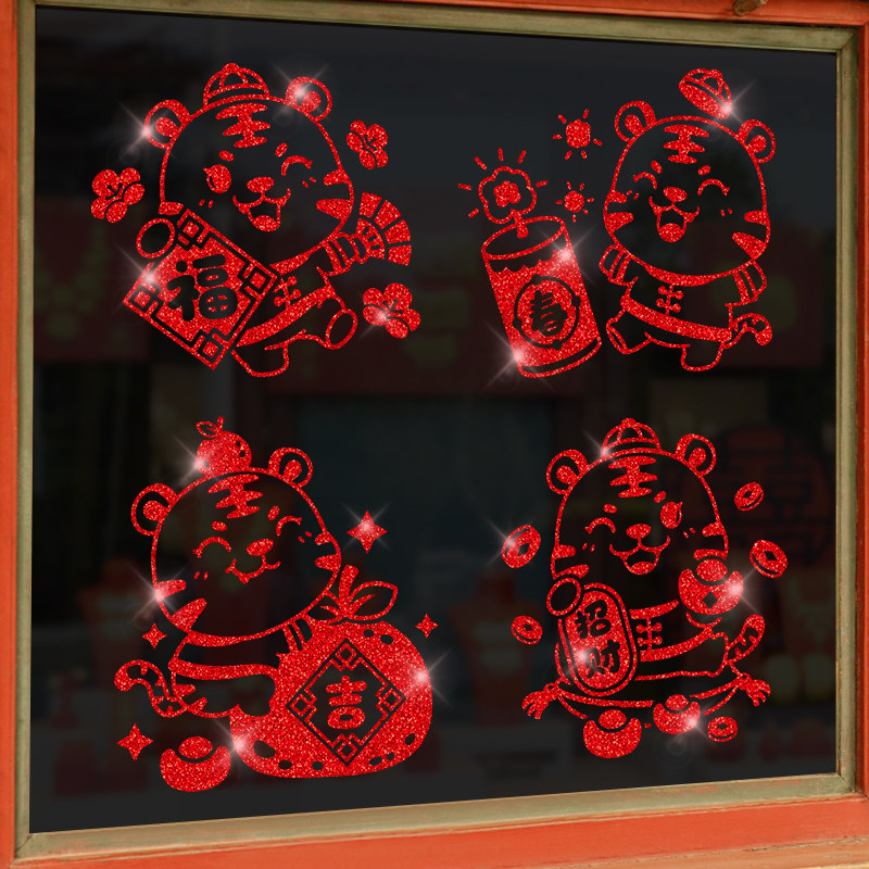 Year of the Tiger Spring Festival Fuzi door sticker 2022 New Year decorative sticker window sticker New Year interior decoration glass window flower paper cut