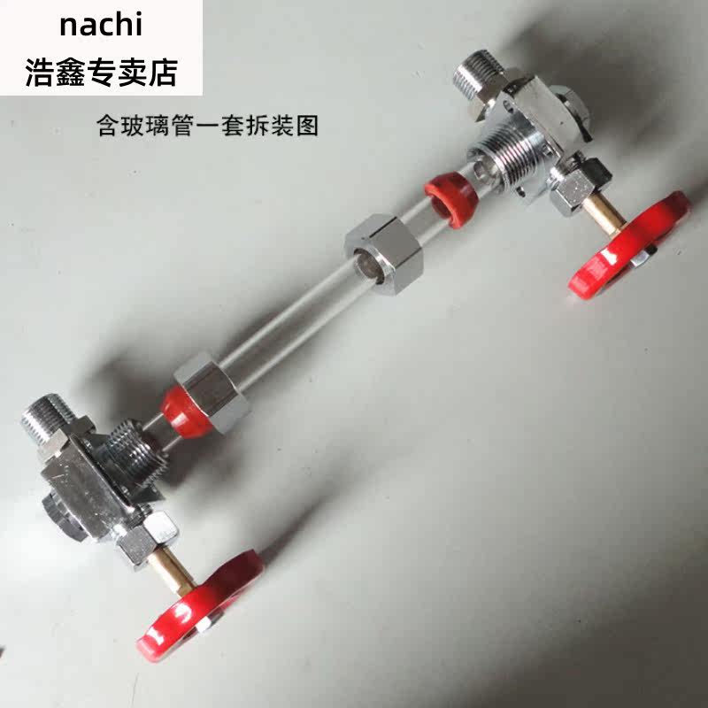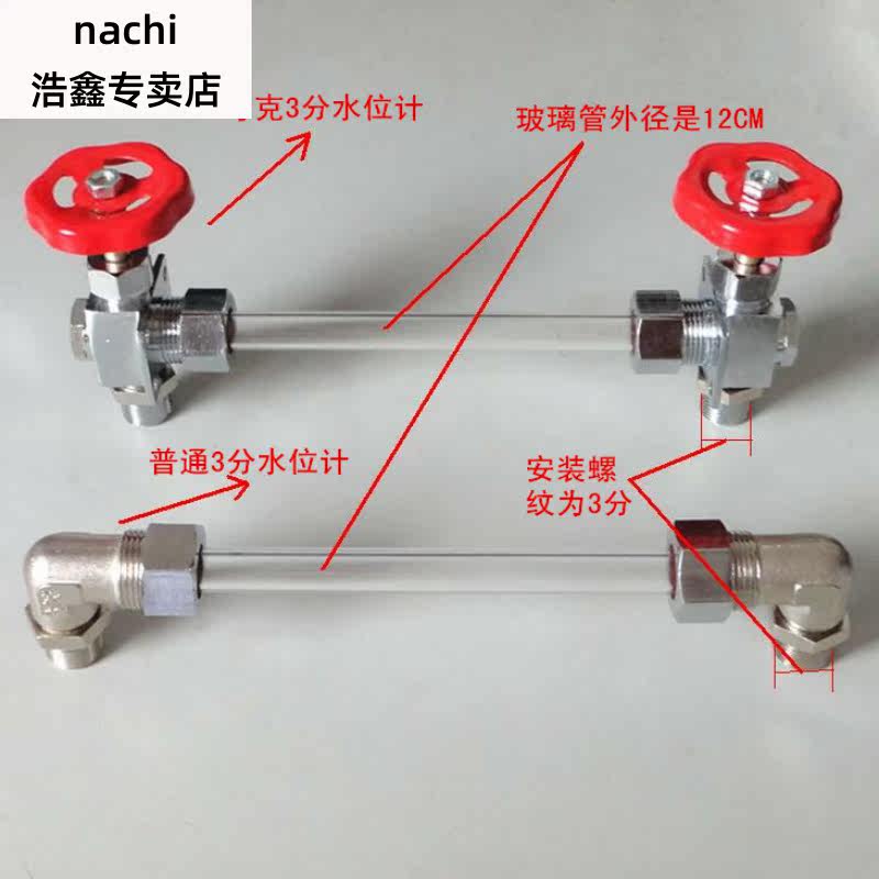 The lower non-connected drain ball valve does not contain the glass tube. The lower part of the water-release ball valve contains the glass tube. The water level gauge elbow does not contain the glass tube.