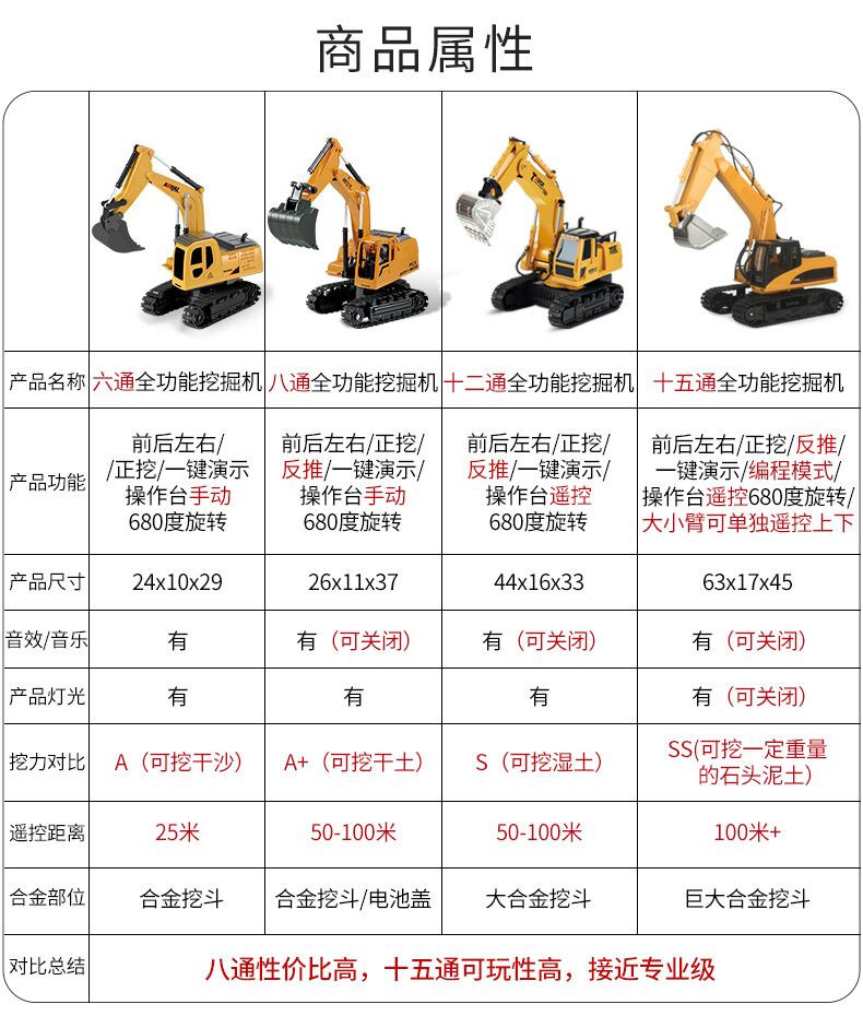 Black alloy bucket 6-channel excavator (front and rear left and right front digging) Classic alloy bucket 6-channel excavator (front and rear left and right front excavation) Alloy bucket 8-channel excavator (front and rear left and right front digging reverse push) Full head alloy 8-channel dump truck (front and rear left and right rise and fall) Alloy bucket 12-channel excavator (remote control console 680 degree rotation) Alloy large 15-way alloy excavator (multi-stage control of head and robotic arm) Full push head alloy 9-channel bulldozer (the entire pusher is alloy) Alloy 8 Channel Family Combination Set (with Space Sand Suit + Sand Table) Alloy 12 Channel Family Combination Set (with Space Sand Suit + Sand Table) Large 15-way Remote Control Excavator (Multi-stage Control of Cut head and robotic arm) ↑↑↑↑↑ New improved thickened track, wear resistant and not easy to break ↑↑↑↑ 5 channel remote control excavator (front and back left and right front digging)