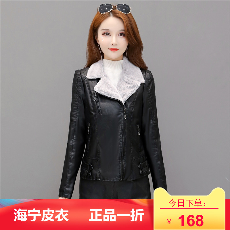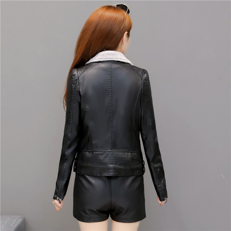 Leather women's short Korean version slim slim plush thickened small coat PU motorcycle black leather jacket spring and winter