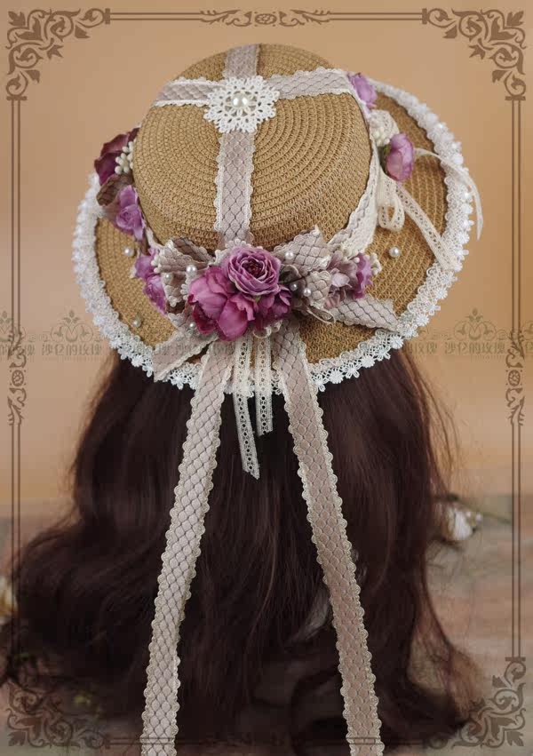 Original * Tian Yuan poetry article * Heavy work Classical Lolita flower lace butterfly knot long floating with wheat straw hat
