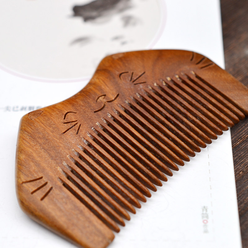 Wood Comb Green Sandalwood Engraving Comb Vintage Ancient Wind Cute Cat Face Mini Small Comb Mini