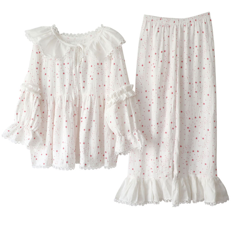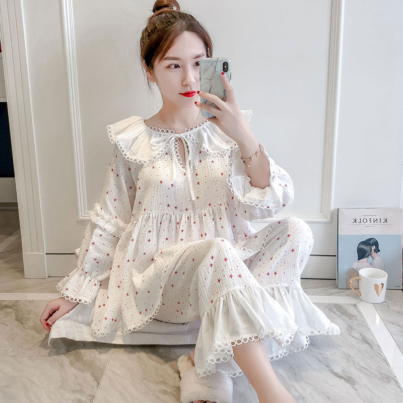 Palace Wind White Pyjamas Woman Pure Cotton Spring Autumn Sweet Beauty Summer Gauze Cotton Doll Collar Princess Wind Home Suit Suit
