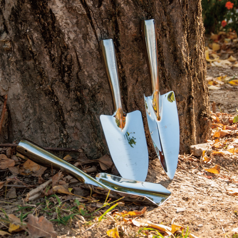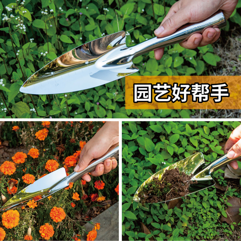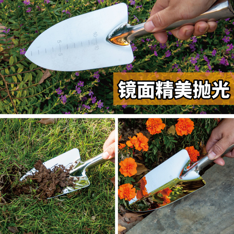 One stainless steel scale small wide shovel one stainless steel scale small narrow shovel one stainless steel small square shovel one stainless steel small three-tooth rake one stainless steel drafter (stainless steel handle) stainless steel three
