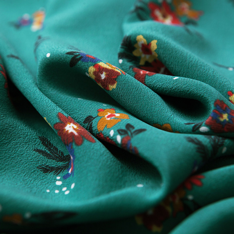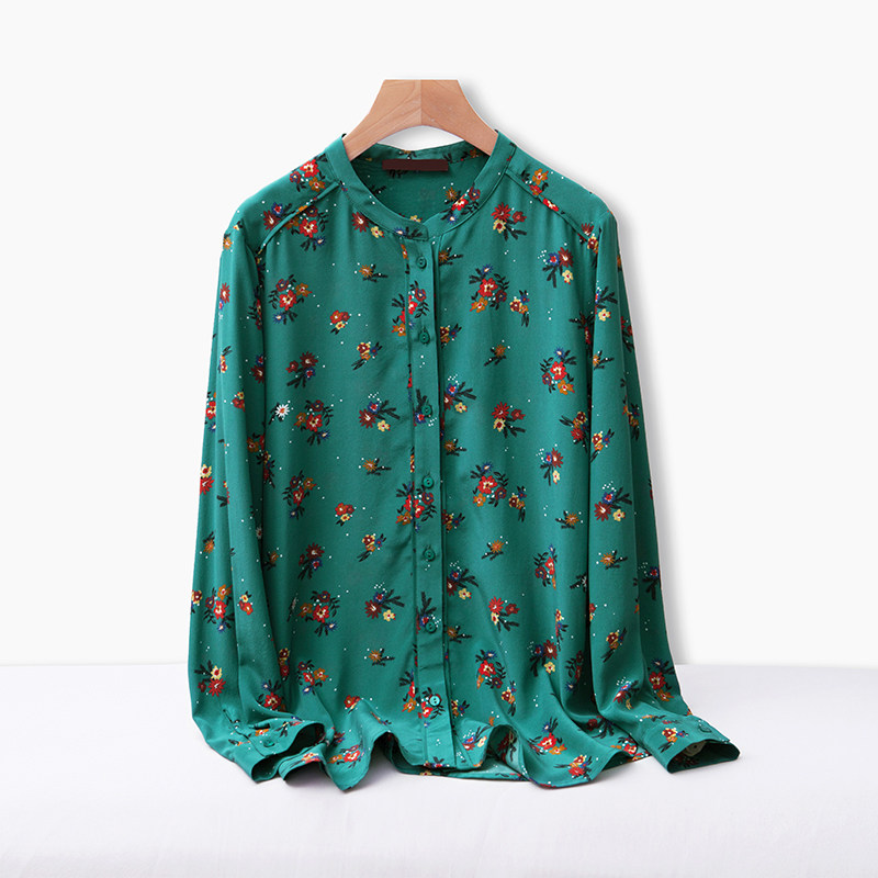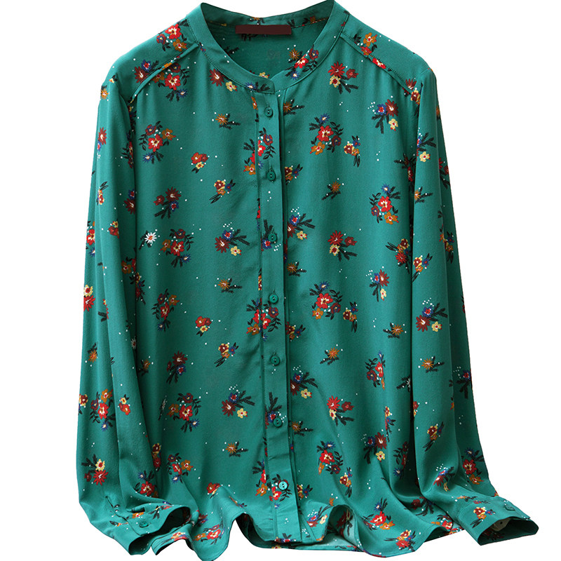 Meishejia French retro green small floral temperament stand-up collar soft waxy printed crepe de chine silk long-sleeved shirt for women