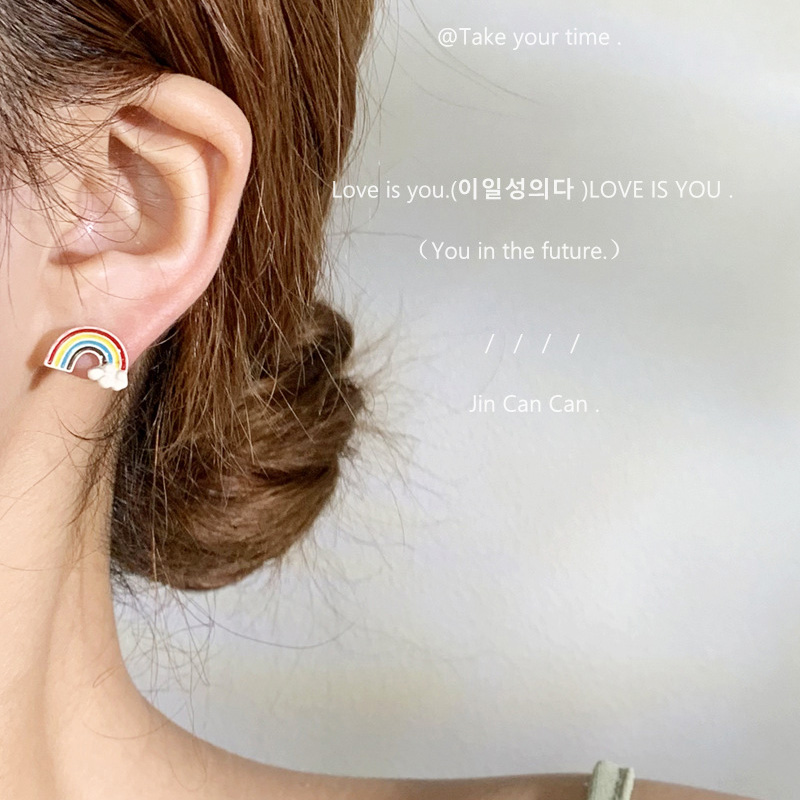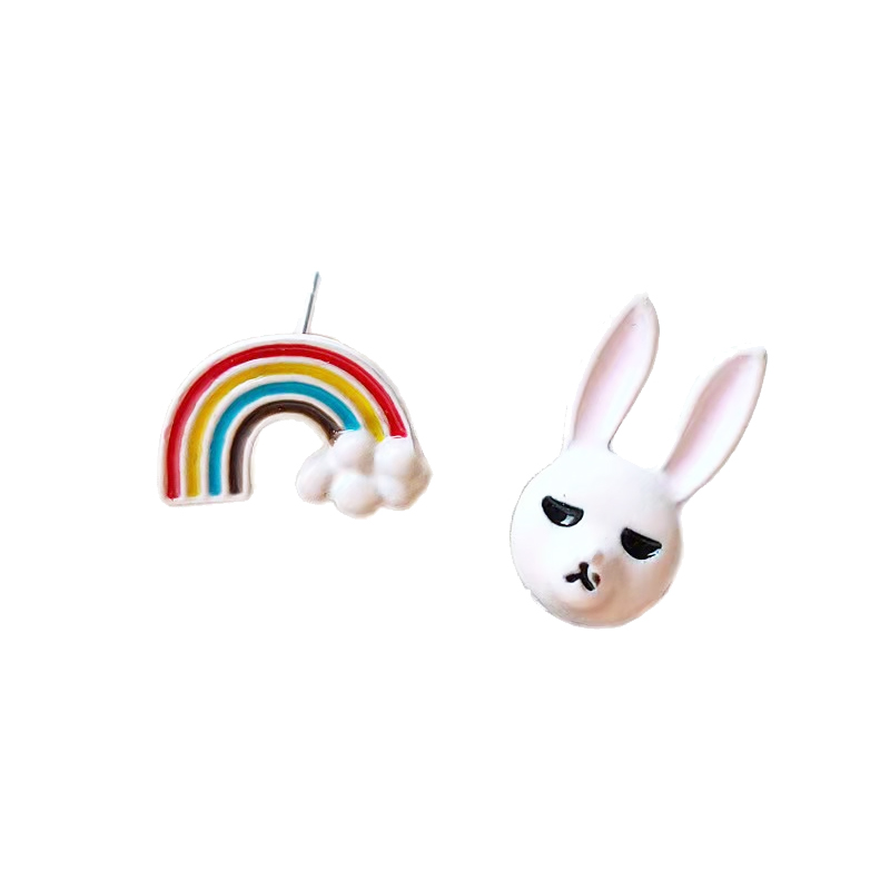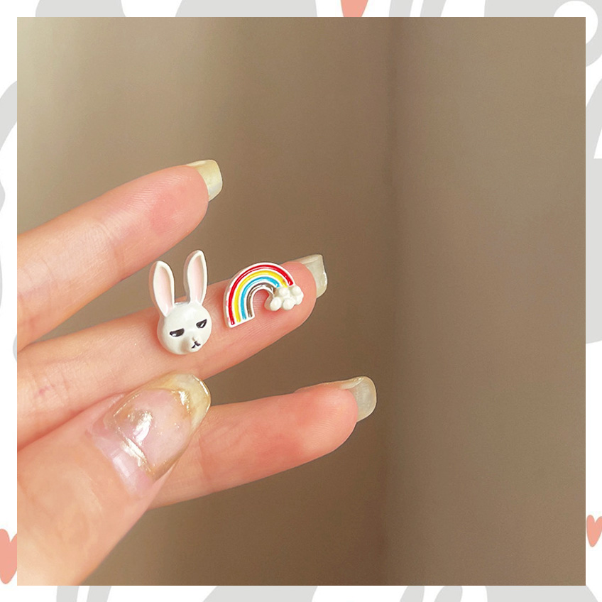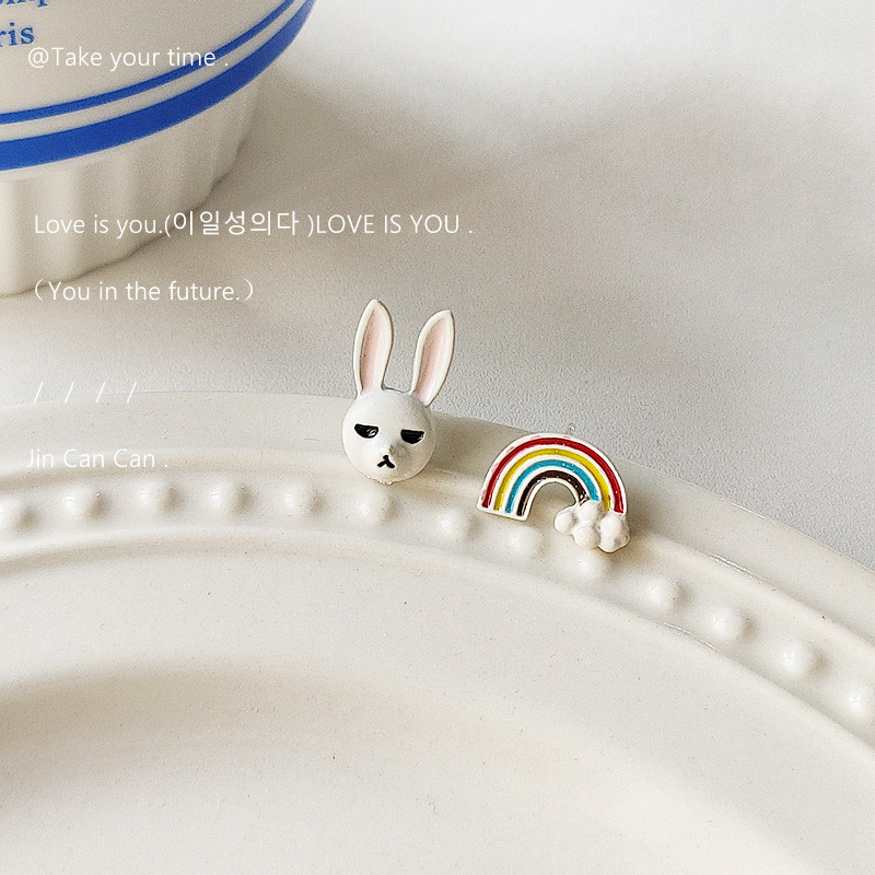 Fun cartoon asymmetric cute rabbit rainbow earrings girly temperament dripping oil earrings simple and small white earrings