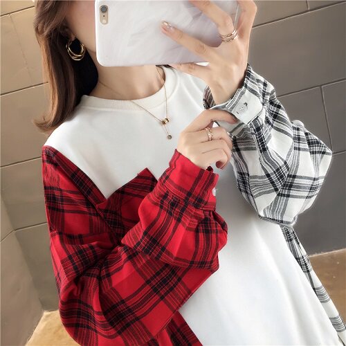 2021 spring new hooded sweater women's spring and autumn thin section fat mm large size loose medium and long plaid stitching top