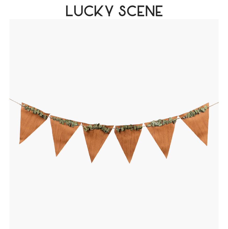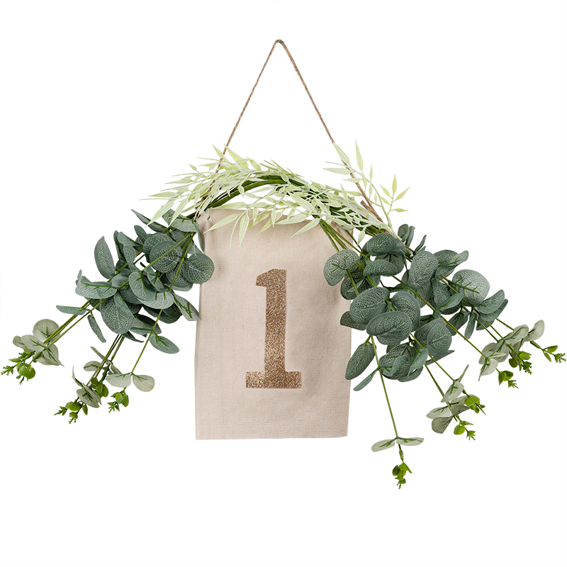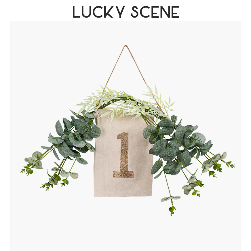 (Auspicious props) Mori's one-year-old green plant hanging flag, natural eucalyptus dried flower and wood grain hanging ornament hundred-day birthday