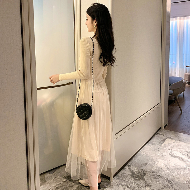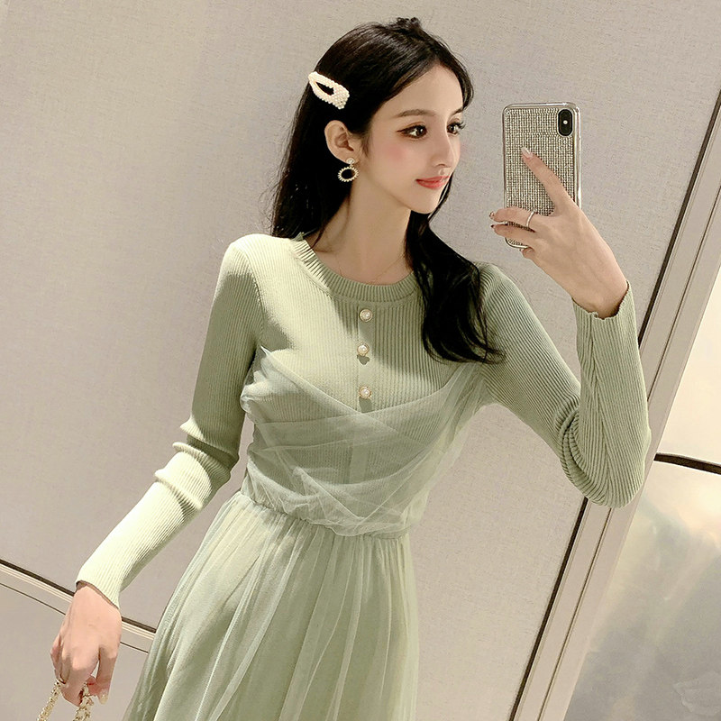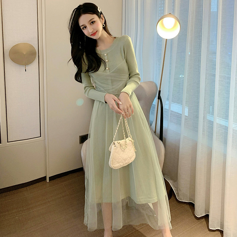 2022 spring and autumn fairy mesh fake two-piece knitted dress carefully machine waist mid-length version of super fairy skirt