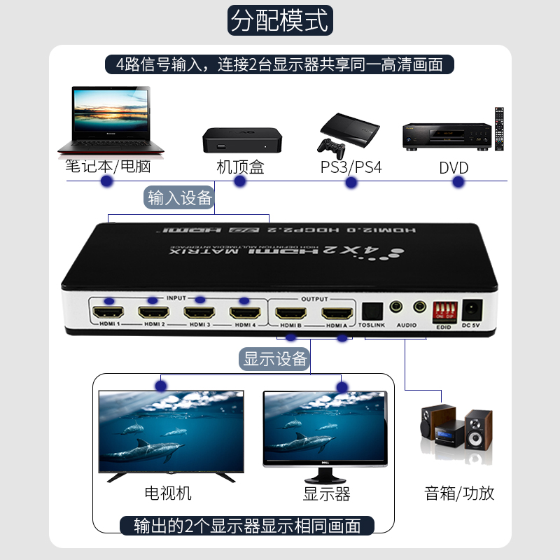 hdmi switcher 4 in 2 out audio splitter 2 0 version 4K60hz HD matrix support onboard box