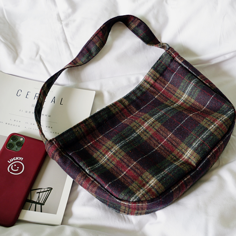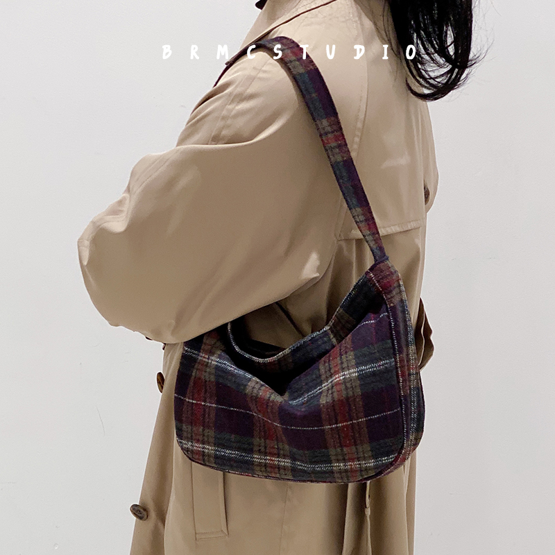 This color is so beautiful ~ retro plum sauce woolen plaid baguette bag autumn and winter all-match portable shoulder bag