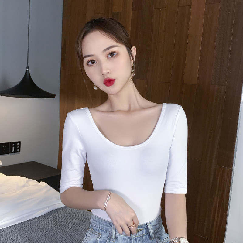 Black 50%-sleeve T-shirt woman 2022 Summer new tight fit 70% sleeve blouses woman body pure cotton half sleeve u collar 5