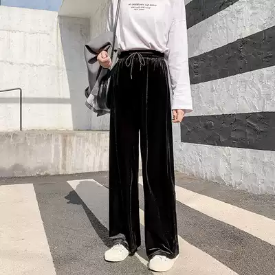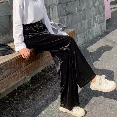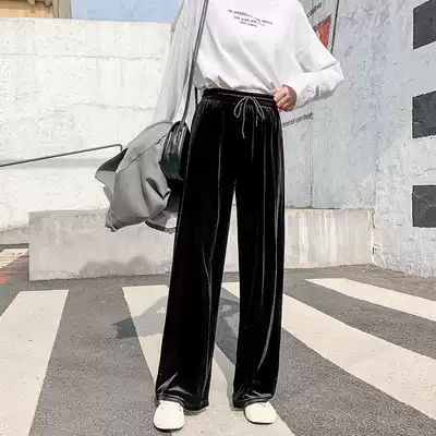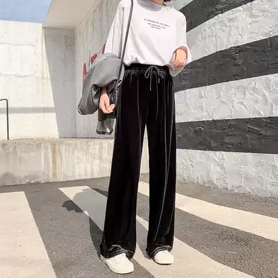 Golden velvet wide leg pants women's spring, autumn and winter, high waist, loose drag, long pants, straight tube, leisure sports tide